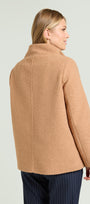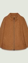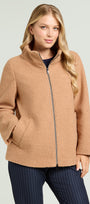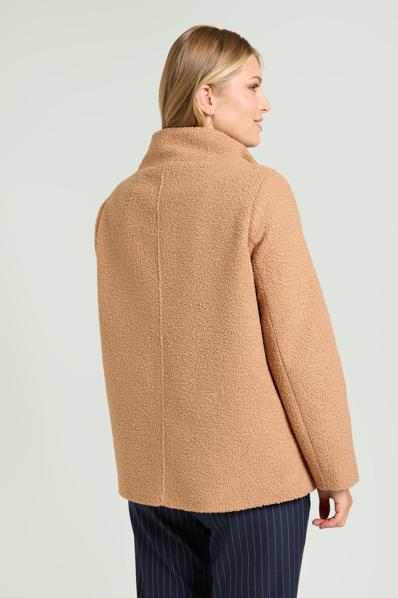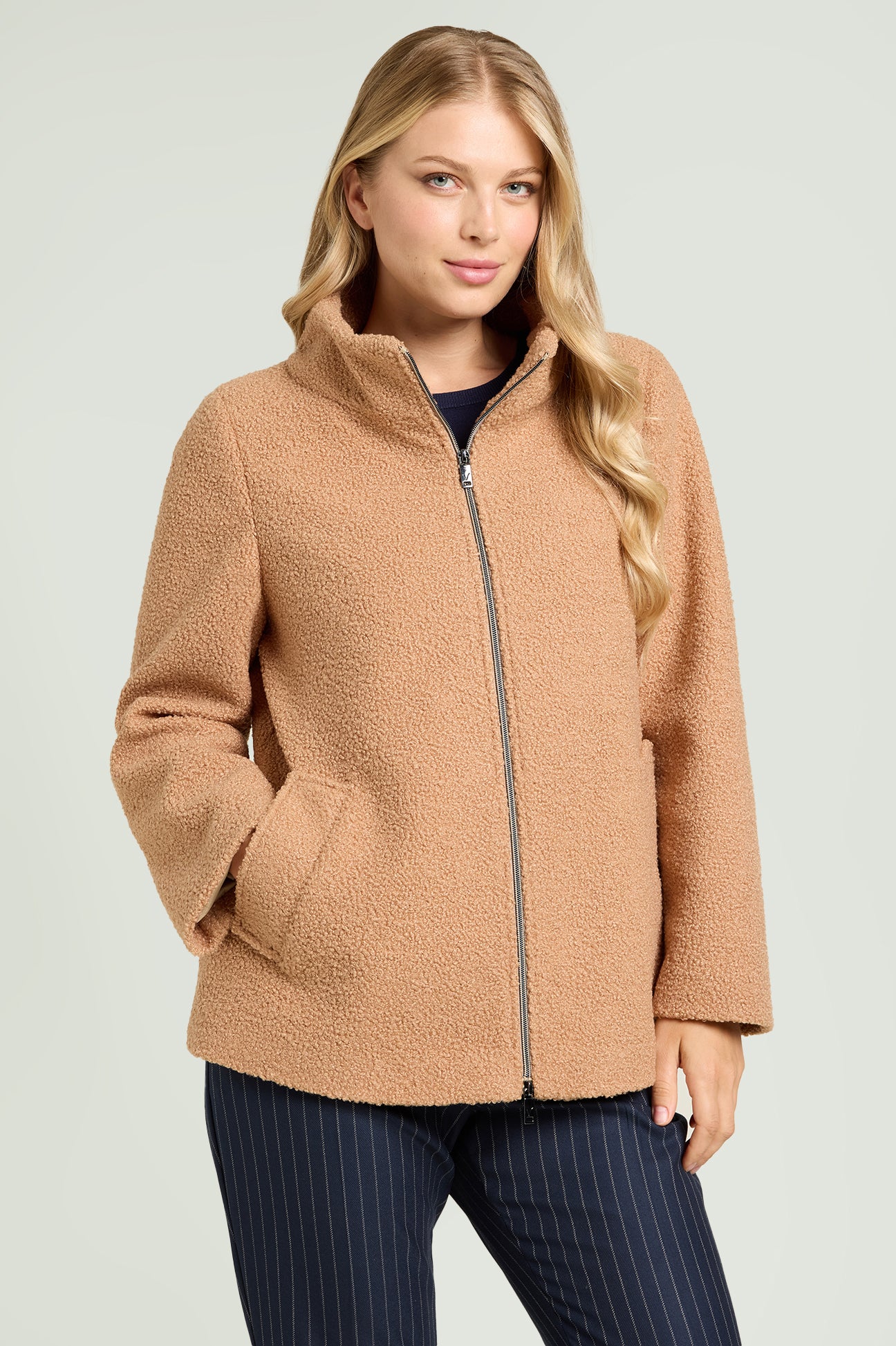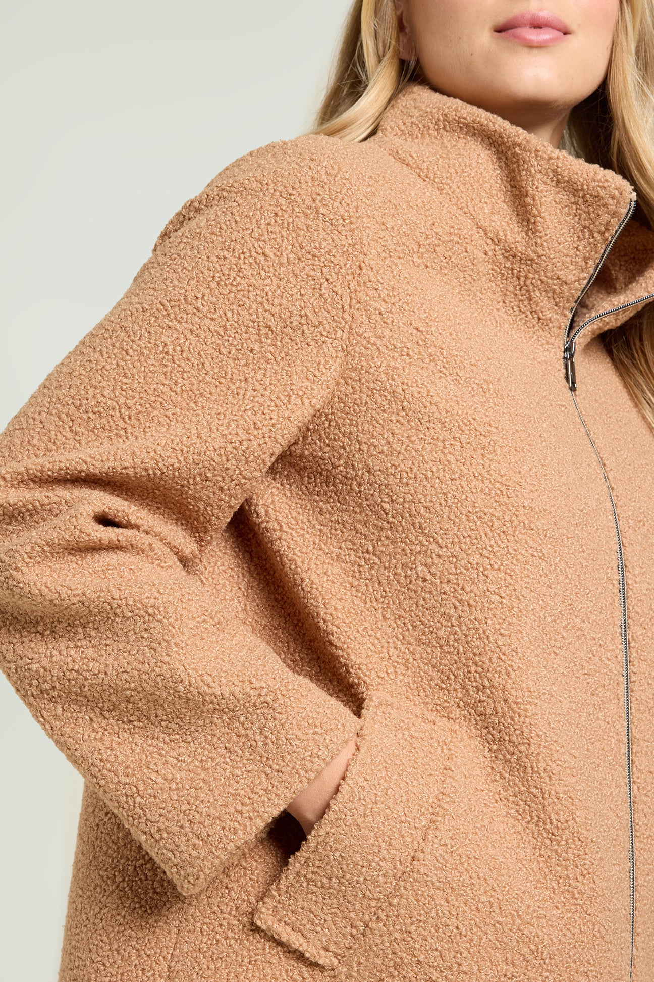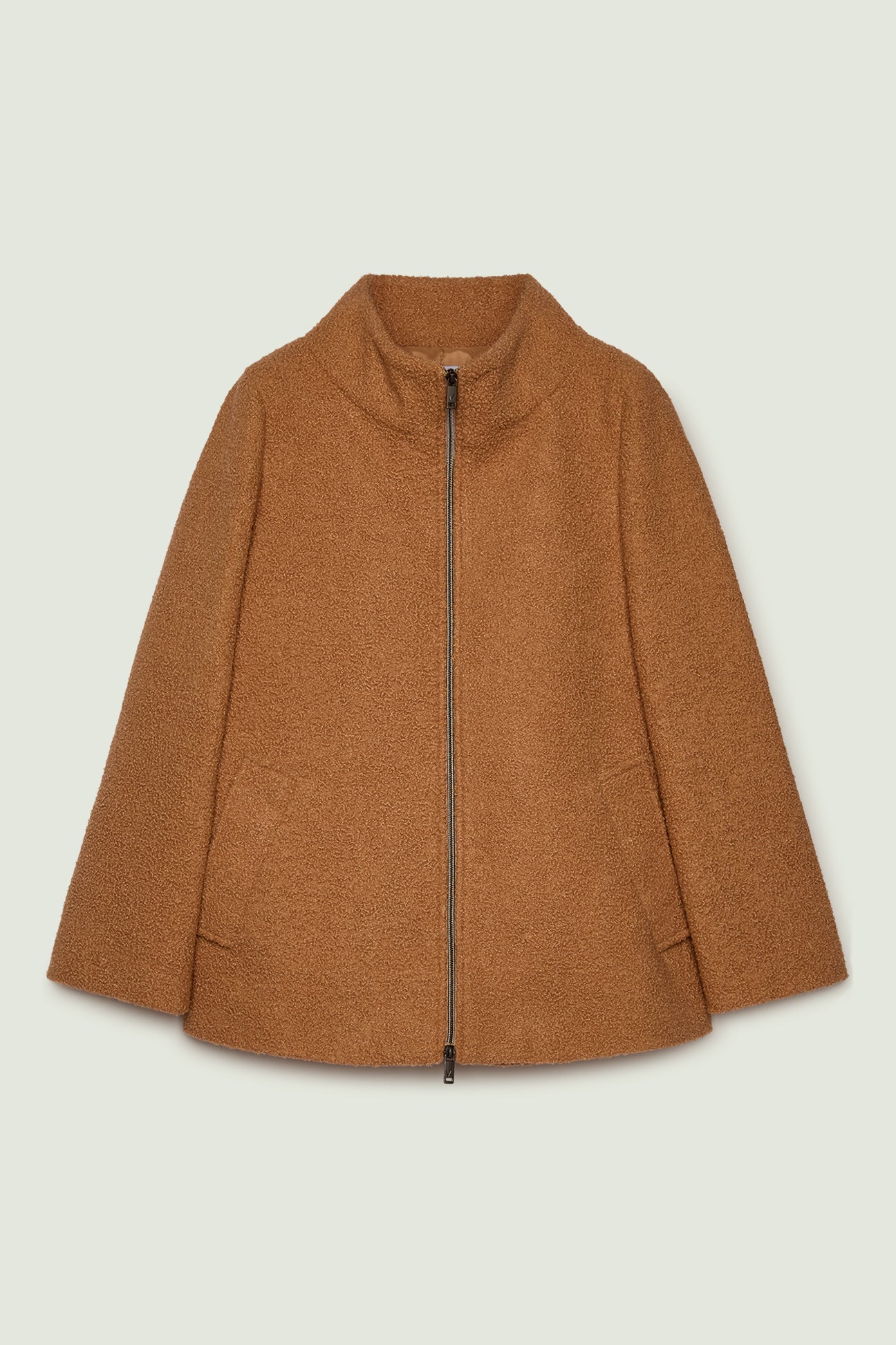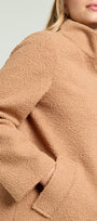 Giaccone in tessuto orsetto dalla linea dritta. Collo a listino, chiusura con zip bicolor, doppio cursore, tasche inclinate, foderato. Tiretti in metallo con finitura gunmetal, personalizzati con il logo "V" di Luisa Viola.