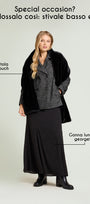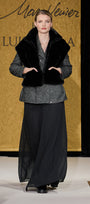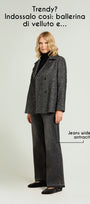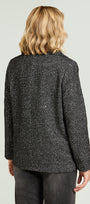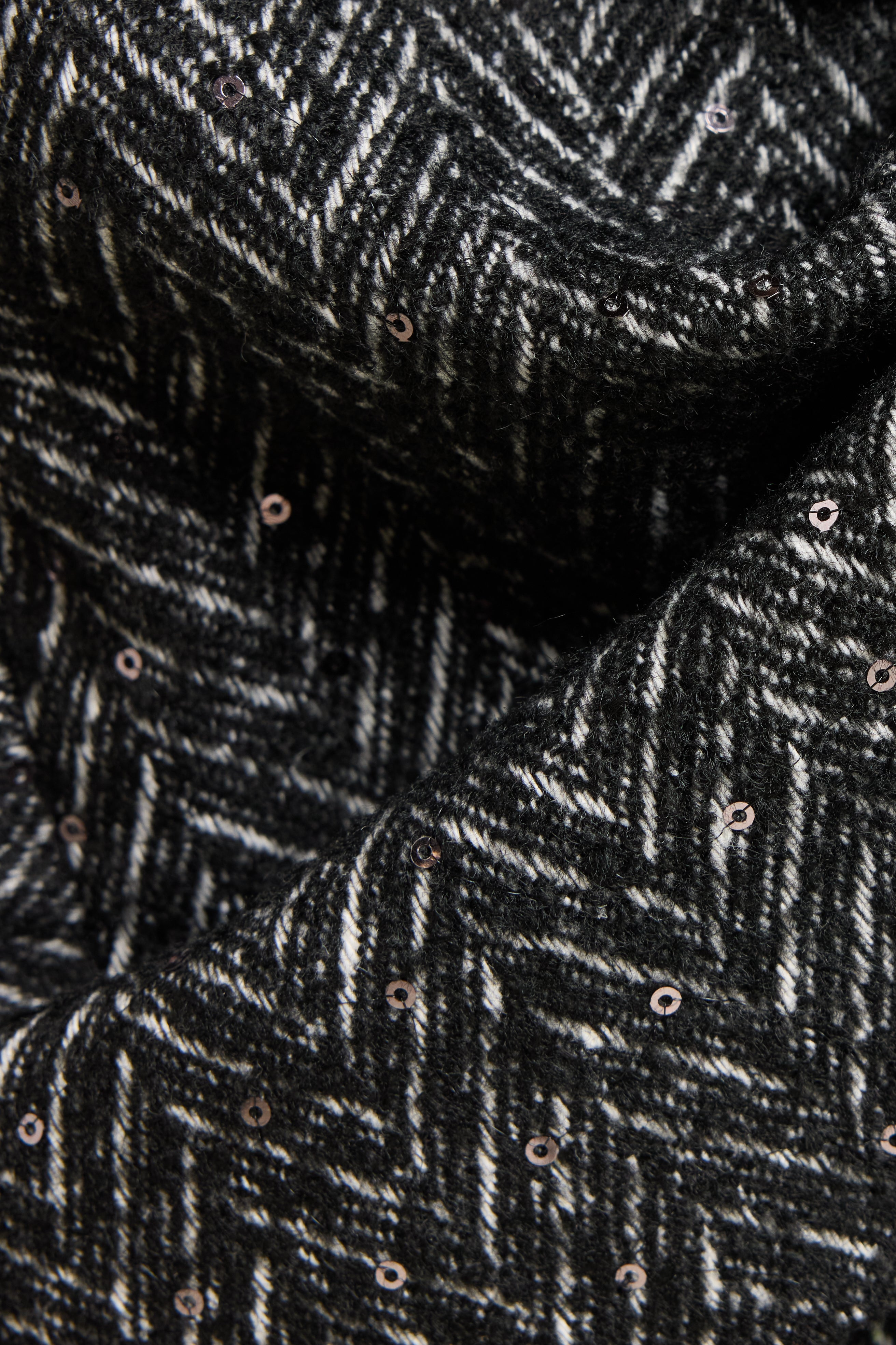 Giaccone doppiopetto realizzato in un tessuto speciale: un chevron mouliné illuminato da una pioggia di piccole paillettes. Linea dritta, collo e rever, chiusura con asole e bottoni, tasche inclinate, foderato.