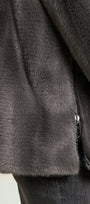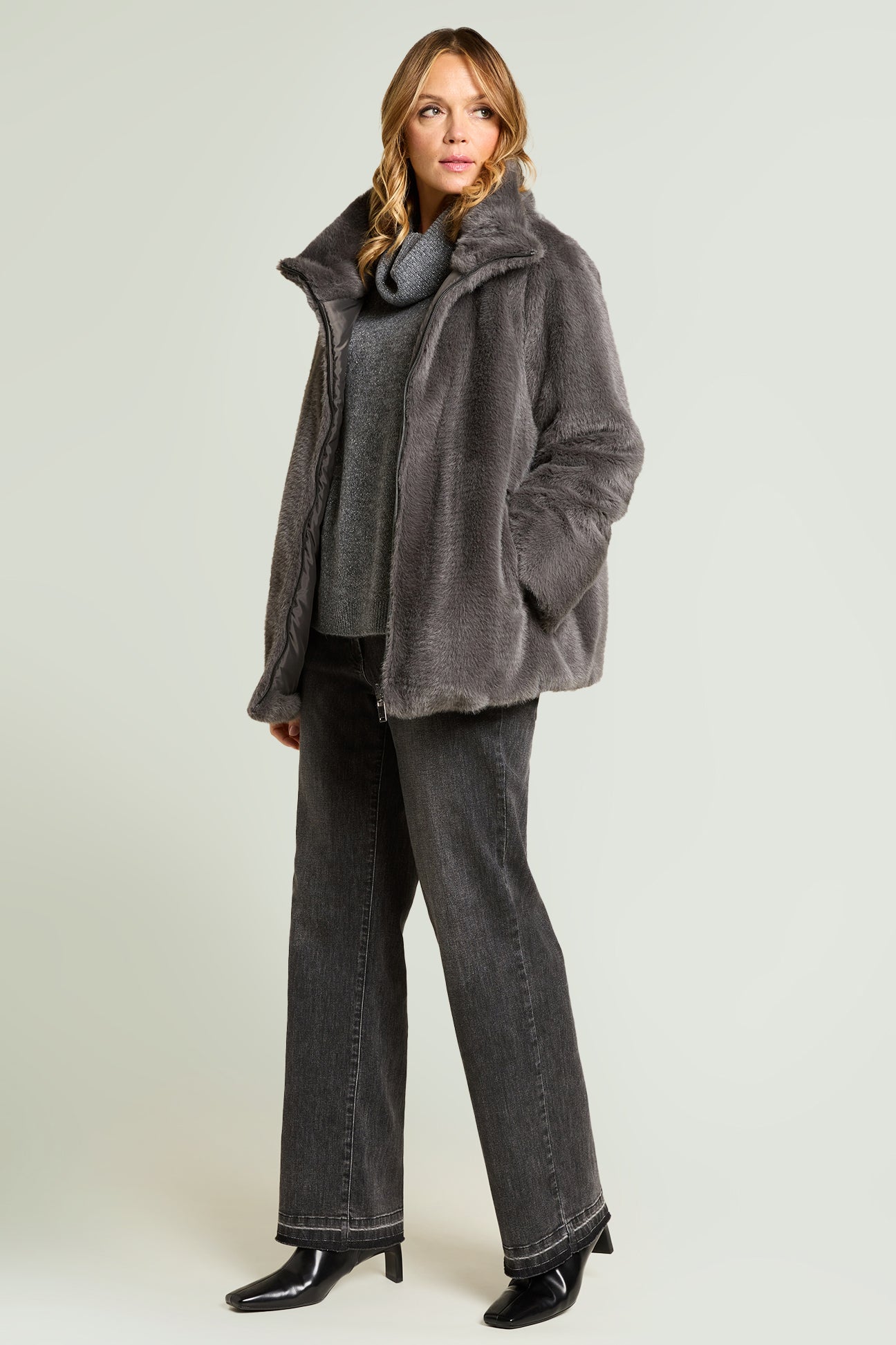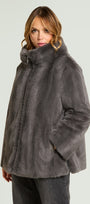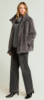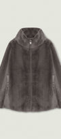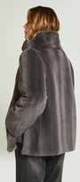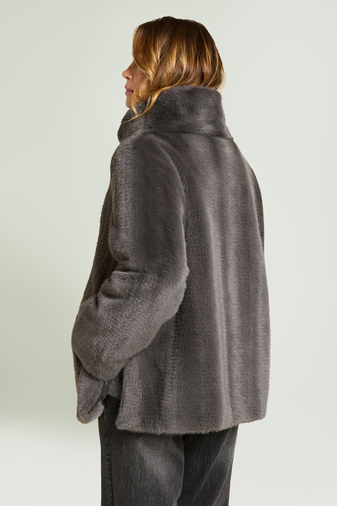 Giaccone bi materico reversibile: da un lato in tessuto a pelo lungo soft touch e dall'altro in tessuto tecnico con leggera imbottitura in ovatta. Linea leggermente svasata. Chiusura con zip, collo a listino, tasche, spacchi laterali con zip. Tiretti in metallo con finitura gunmetal, personalizzati con il logo "V" di Luisa Viola. Realizzato in un sofisticato tono neutro facilmente abbinabile.