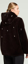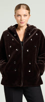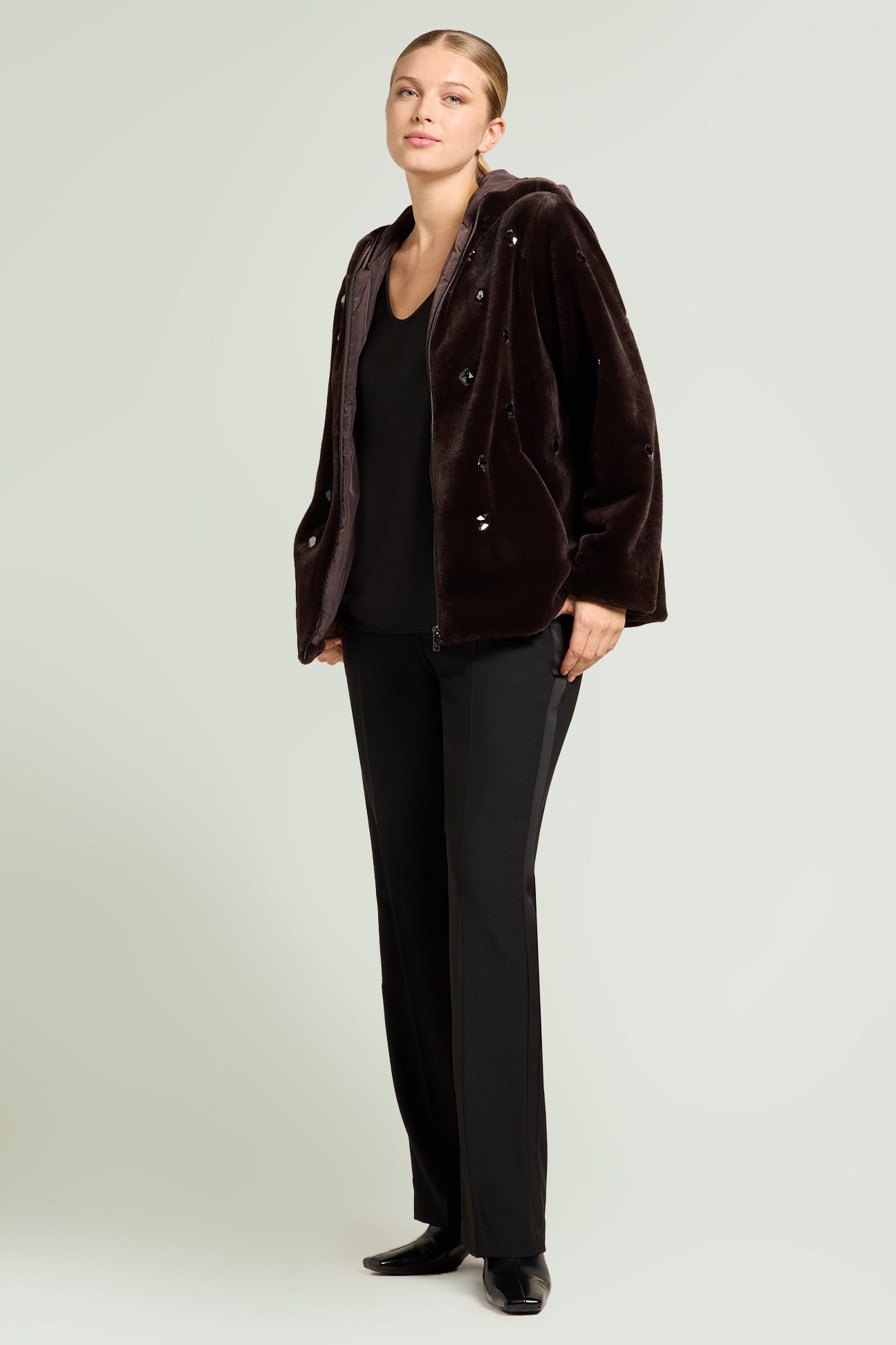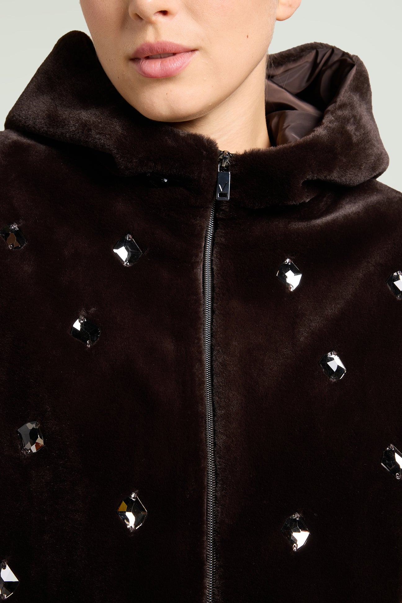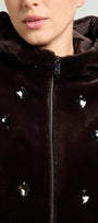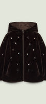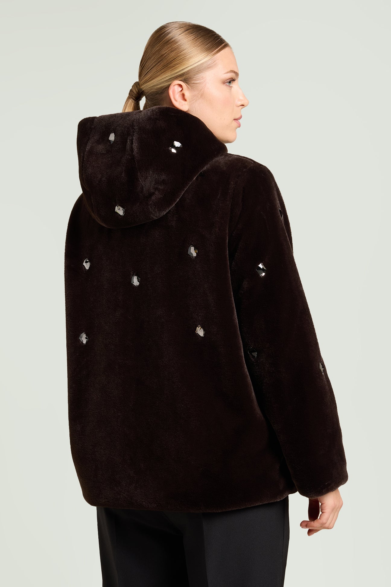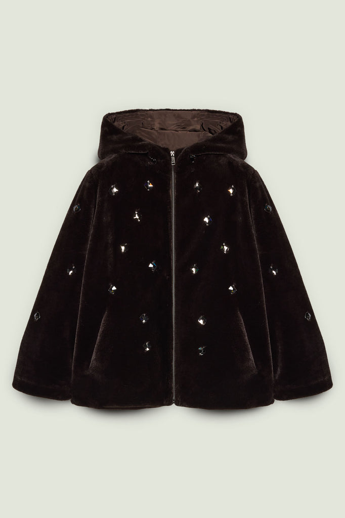 Giaccone con cappuccio realizzato in un piacevole tessuto soft-touch, caratterizzato da una pioggia di castoni in vetro fumè applicati a mano. Chiusura con zip, tasche a fessura. Foderato