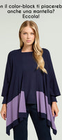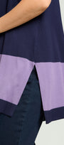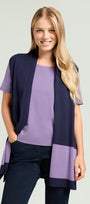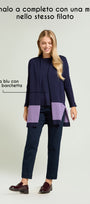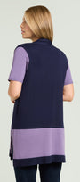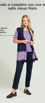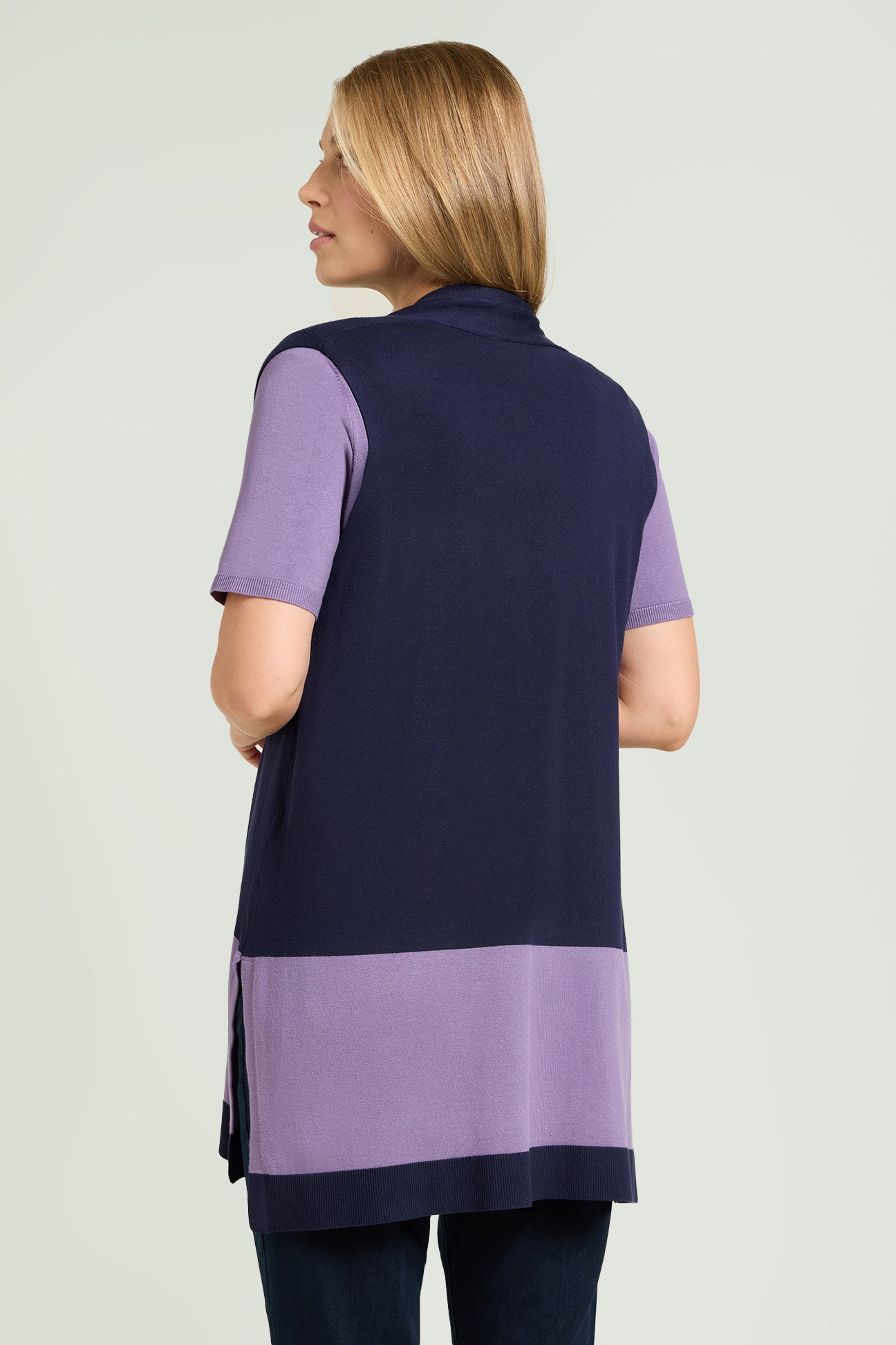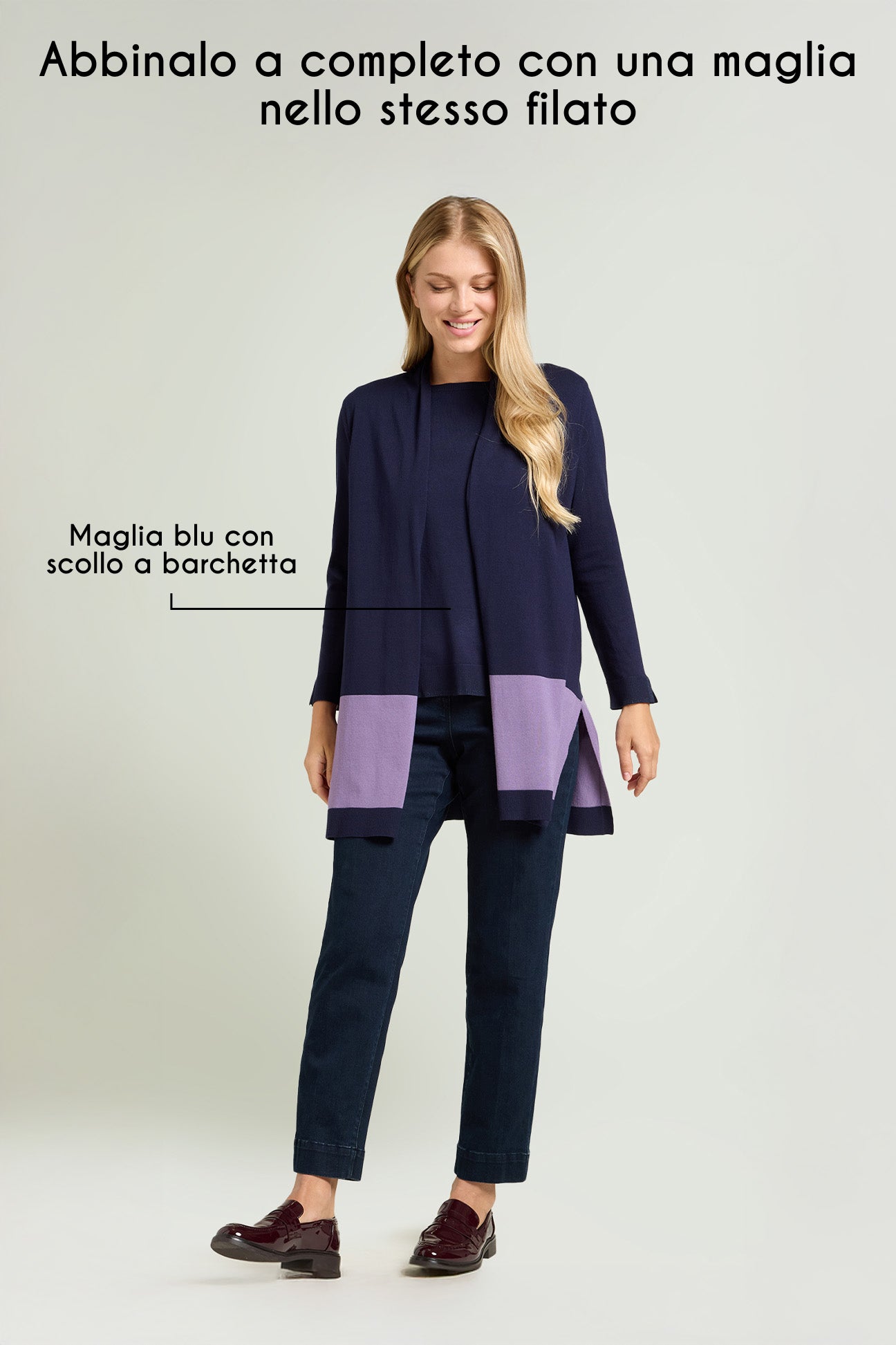 Gilet in maglia blu con color block malva, realizzato in finezza 12 con punto compatto a costine.