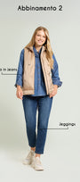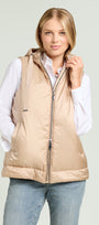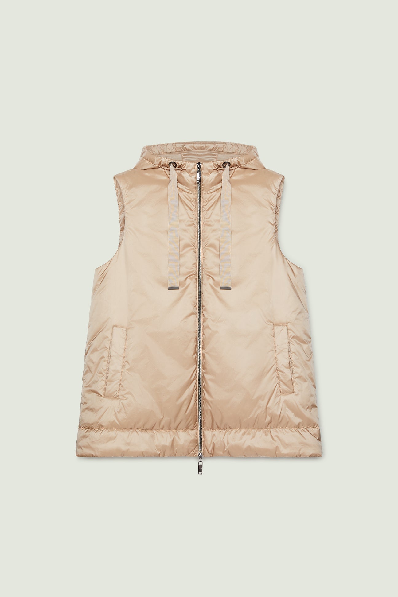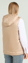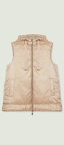 Gilet in nylon cangiante, imbottito con una soffice ovatta. Chiusura con Zip, cappuccio con coulisse, nastro Gros Grain con puntali in metallo, tasche inclinate. Tiretti con finitura gunmetal, personalizzati con il logo "V" di Luisa Viola.