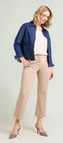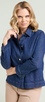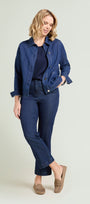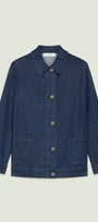 Giubotto in denim-stretch (7,5 once) dalla linea dritta. Colletto, chiusura con asole e bottoni, tasche applicate, manica lunga con polso, sfoderato. Trattamento con ammorbidente, impunture in tono. Dettagli light gold con il logo "V" di Luisa Viola. Facilmente abbinabile, si può anche indossare in coordinato con capi realizzati nello stesso tessuto.
