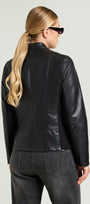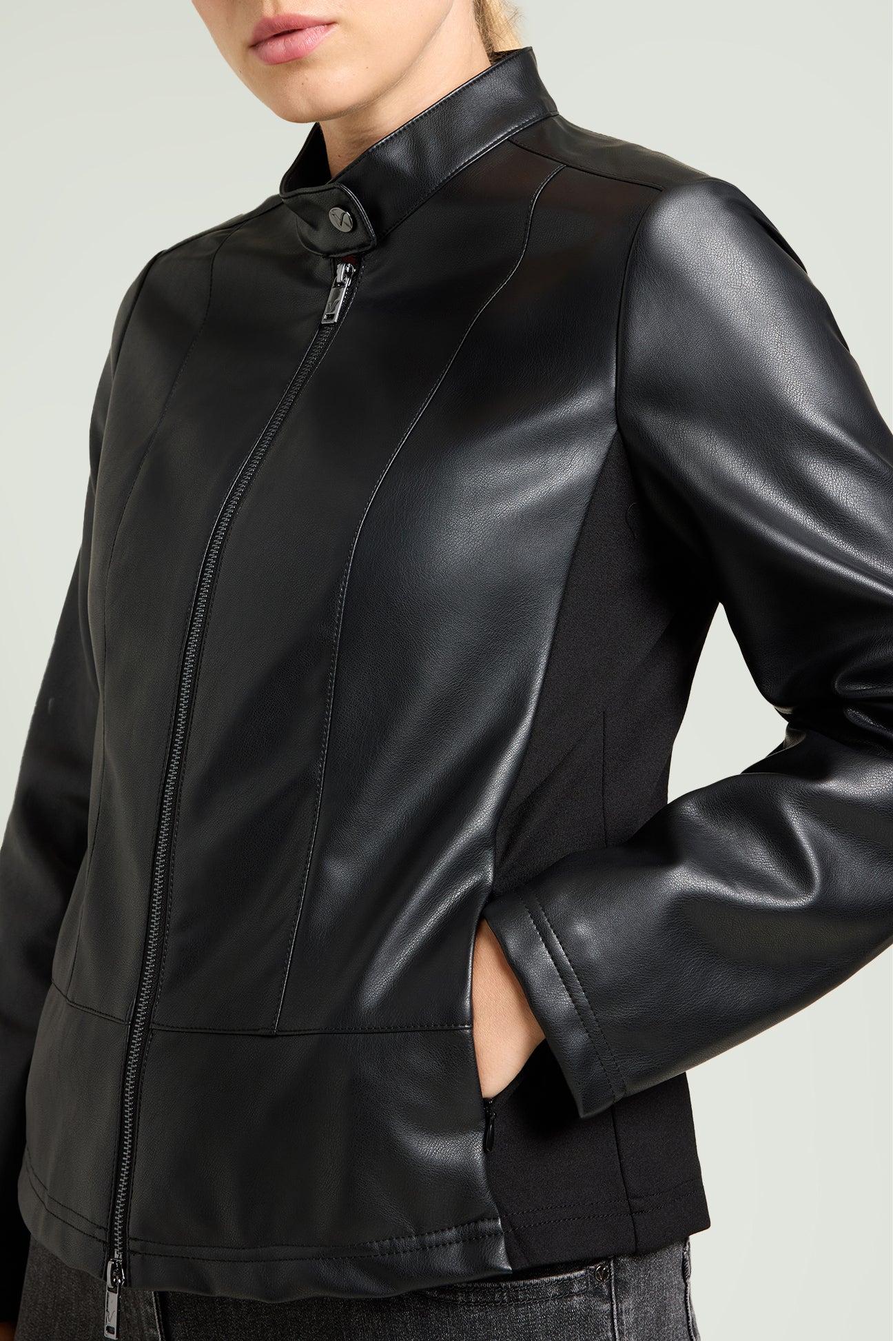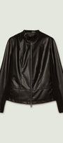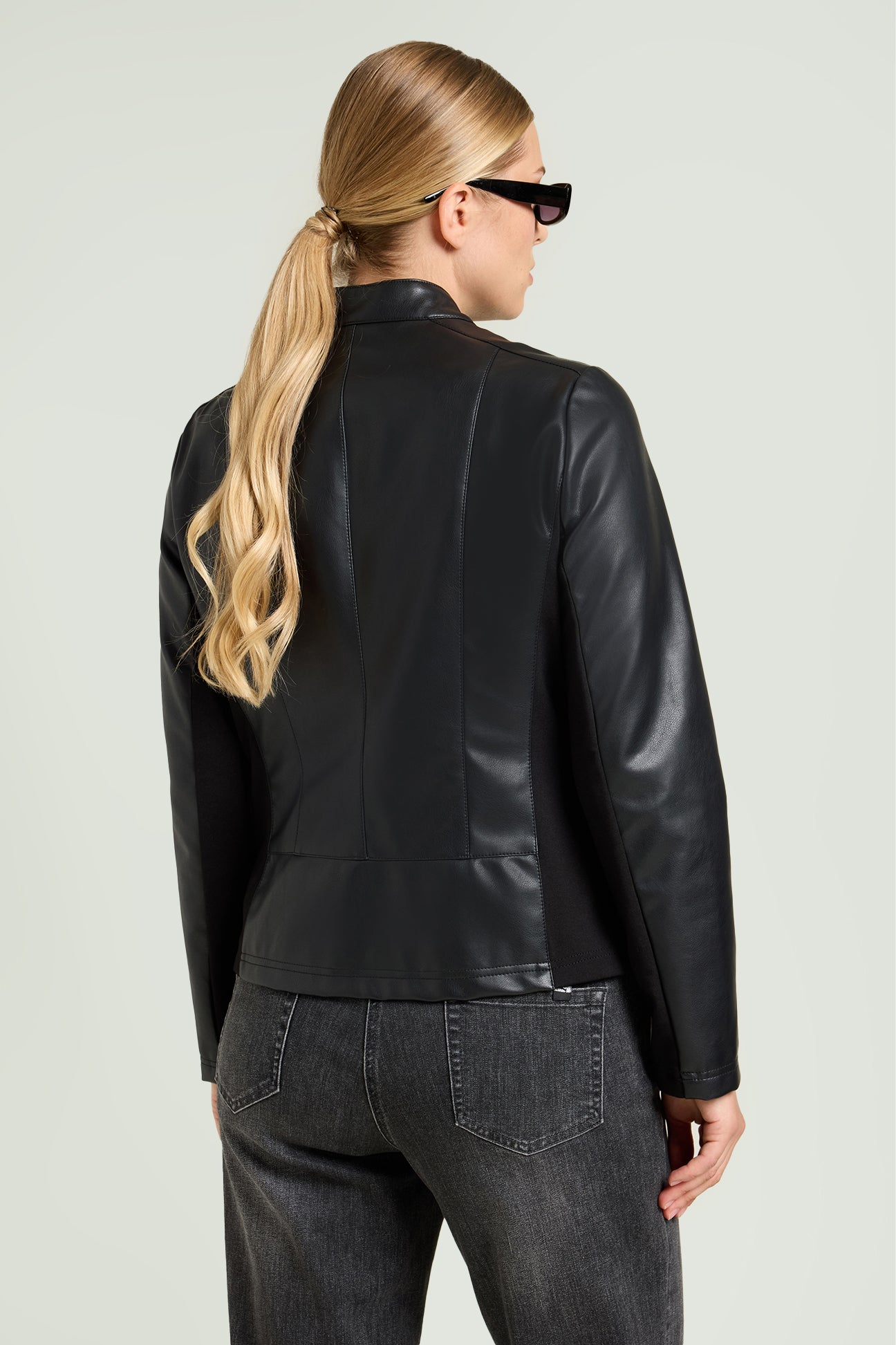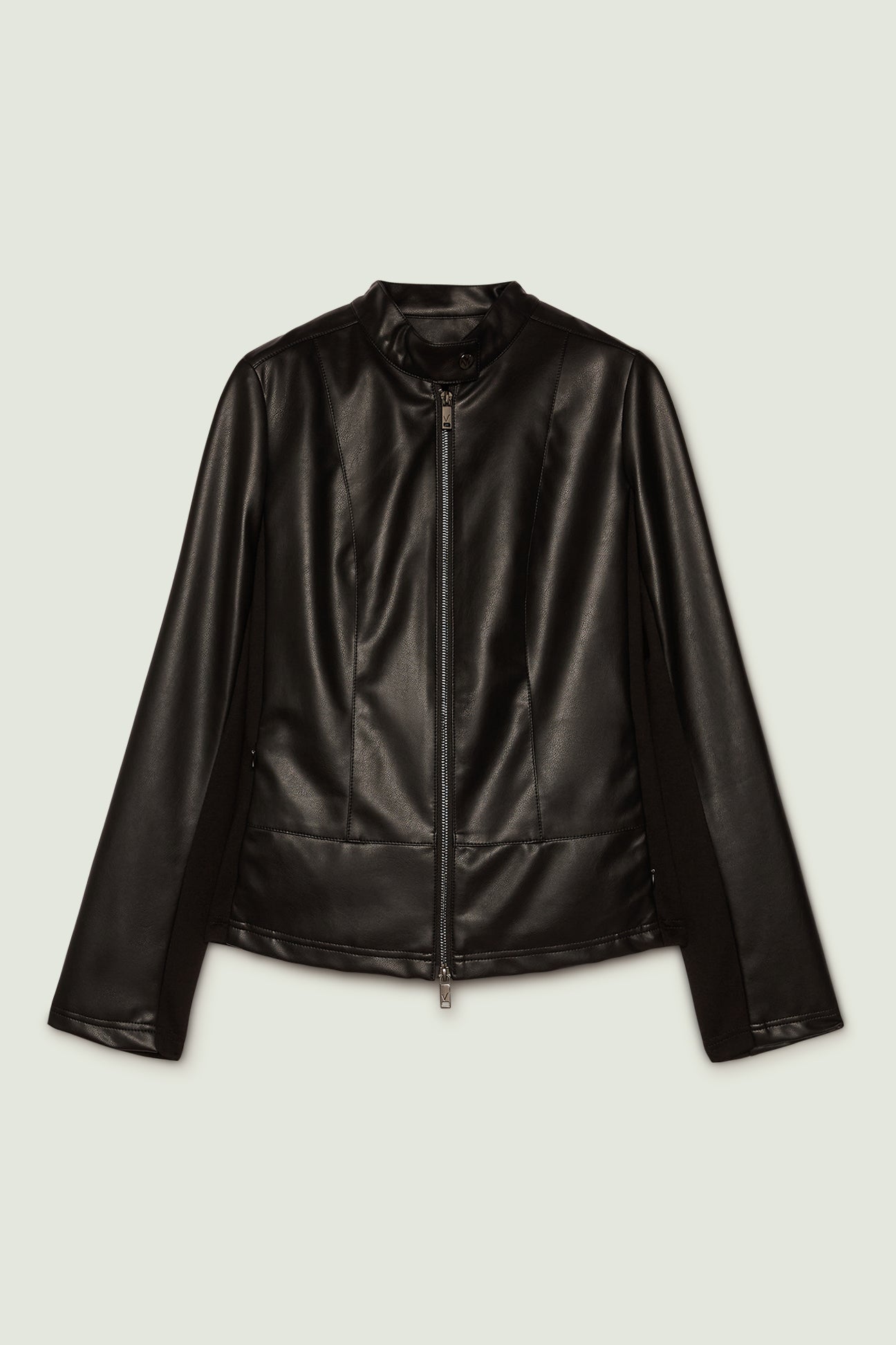 Giubbotto in tessuto tecnico spalmato con particolari in punto stoffa elasticizzato. Linea sciancrata, zip in metallo con finitura gunmetal, collo a listino chiuso da bottone automatico, tasche zippate a scomparsa, foderato. Tiretti e bottoni personalizzati con il logo "V" di Luisa Viola.