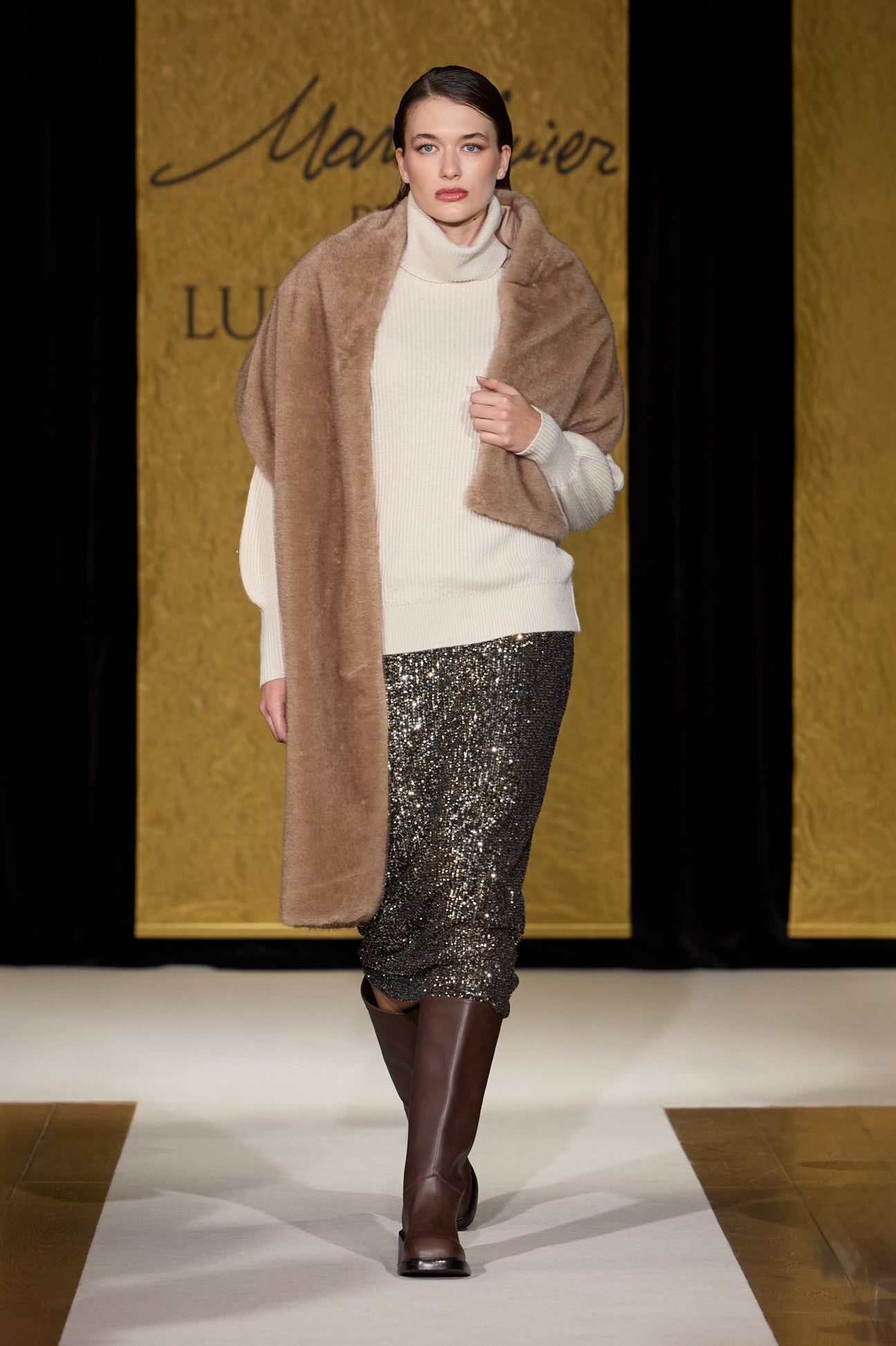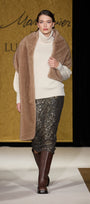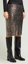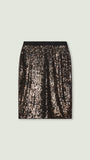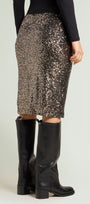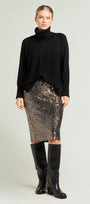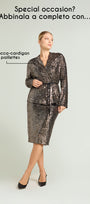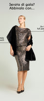 Gonna tubino realizzata in un tulle ricamato molto particolare, dove le paillettes di colore alternato -platino e oro- creano un effetto elegante e sofisticato. Punto vita estensibile con cinturino in gros grain elasticizzato. Tessuto stretch, foderata. Abbinabile a completo con la giacca o la gonna nello stesso tessuto.