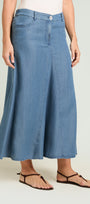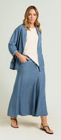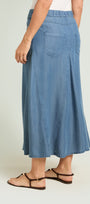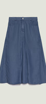 Gonna lunga in chambray dalla linea svasata. Cinturino estensibile con gros grain elastico inserito nel tratto dietro. Chiusura davanti con zip nascosta e bottone. Tasche jeans davanti ed applicate dietro. Trattamento stone washed. Sfoderata. Facilmente abbinabile, si può anche indossare a completo con capi realizzati nello stesso tessuto.
