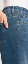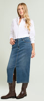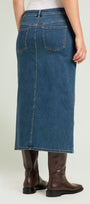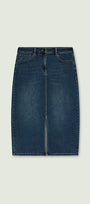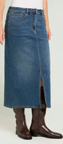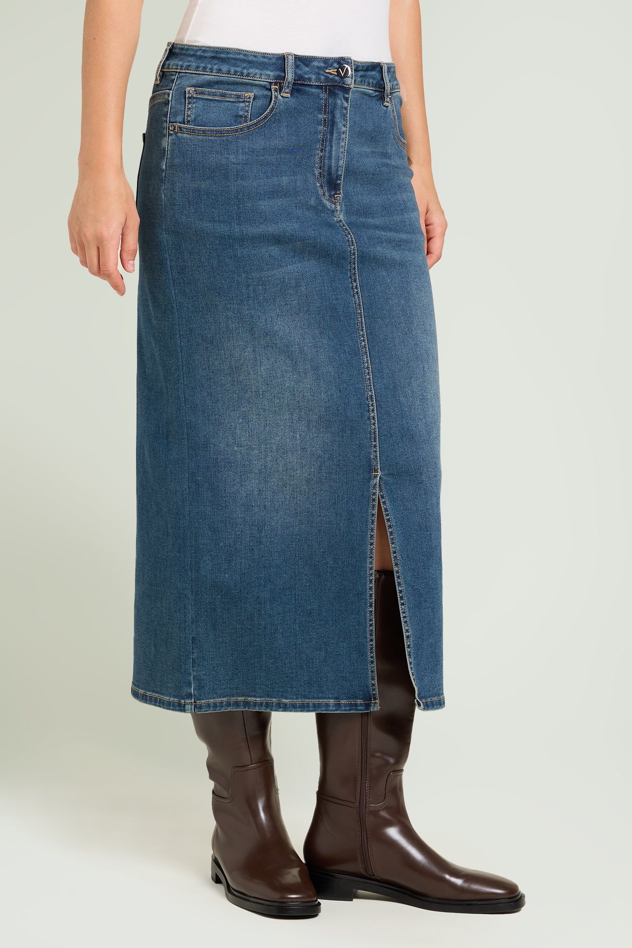 Gonna lunga cinque tasche in Denim stretch (11,5 once) dalla linea dritta con spacco su centro davanti. Cintura in forma con lavorazione estensibile e passanti. Trattamento stone washed con sovratintura e leggera sabbiatura, impunture cammello. Bottone e rivetti gunmetal con il logo "V" di Luisa Viola.
