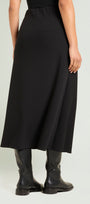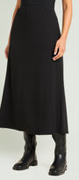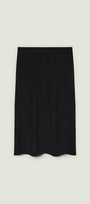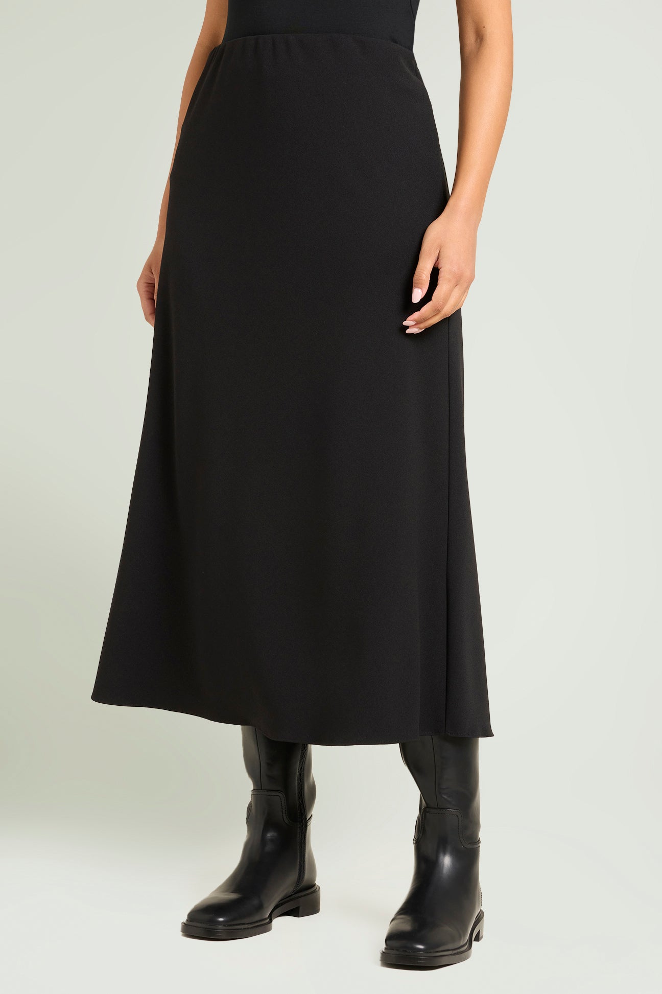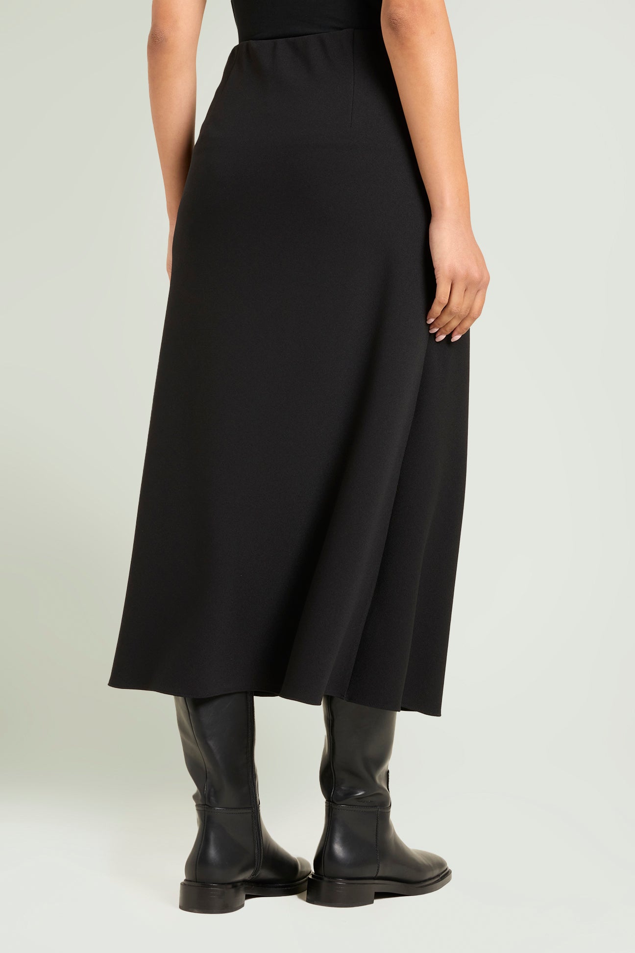 Gonna passepartout in tessuto super-stretch: uno "scuba crepe" dalla caduta fluida caratterizzato da un rovescio raso che dona una piacevole sensazione sulla pelle. Punto vita estensibile con elastico inserito all'interno, taglio sbieco, sfoderata.