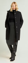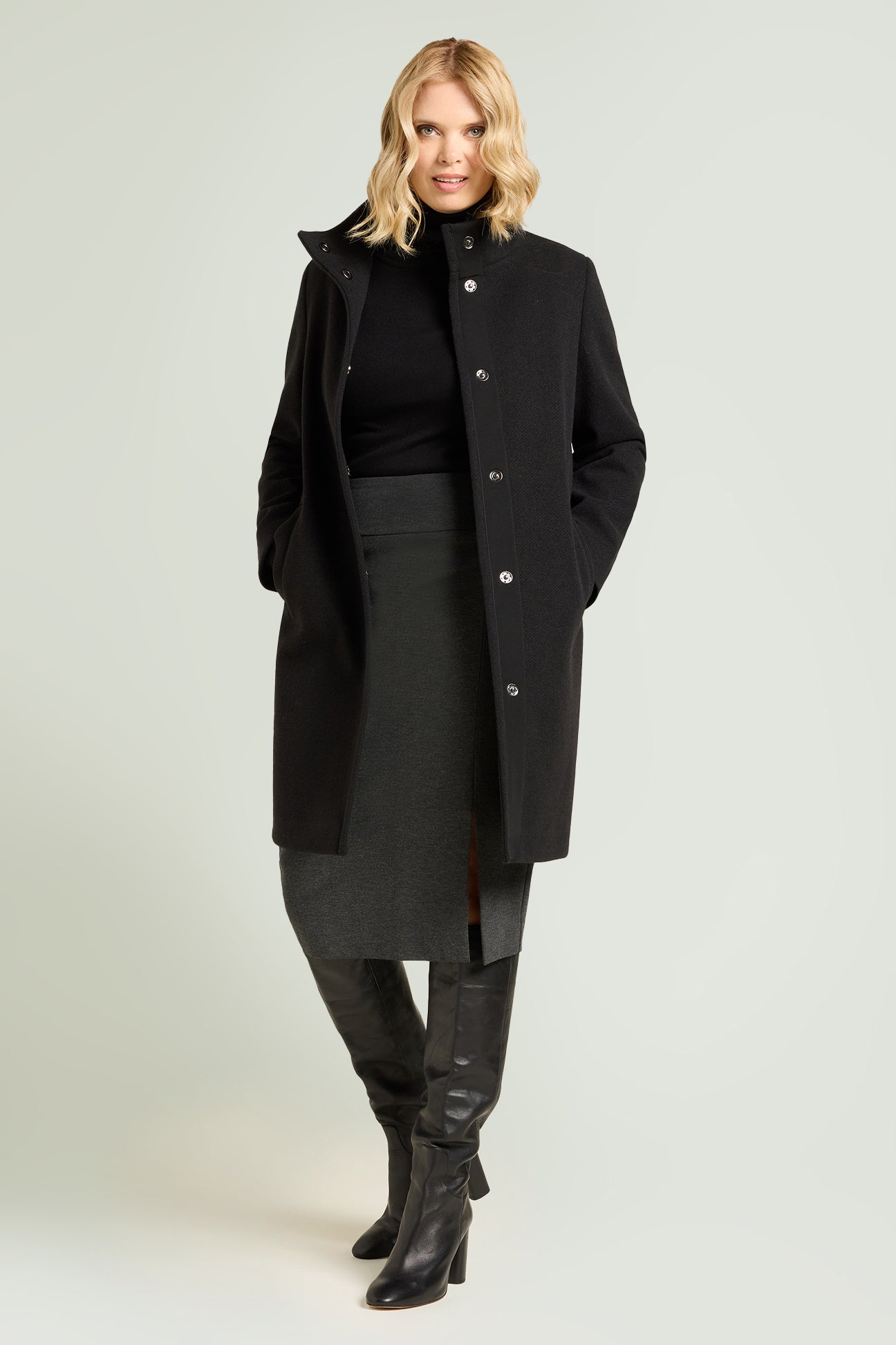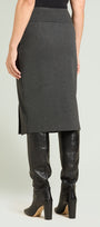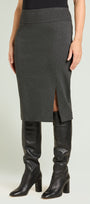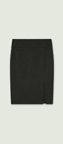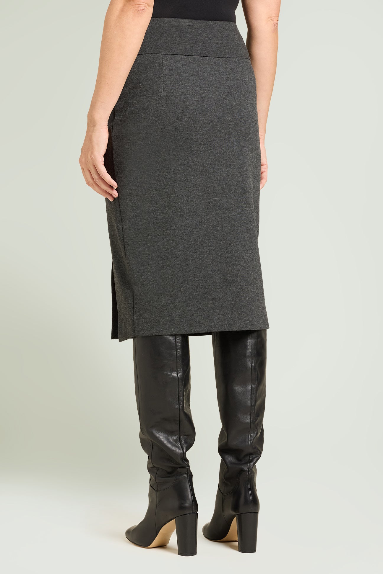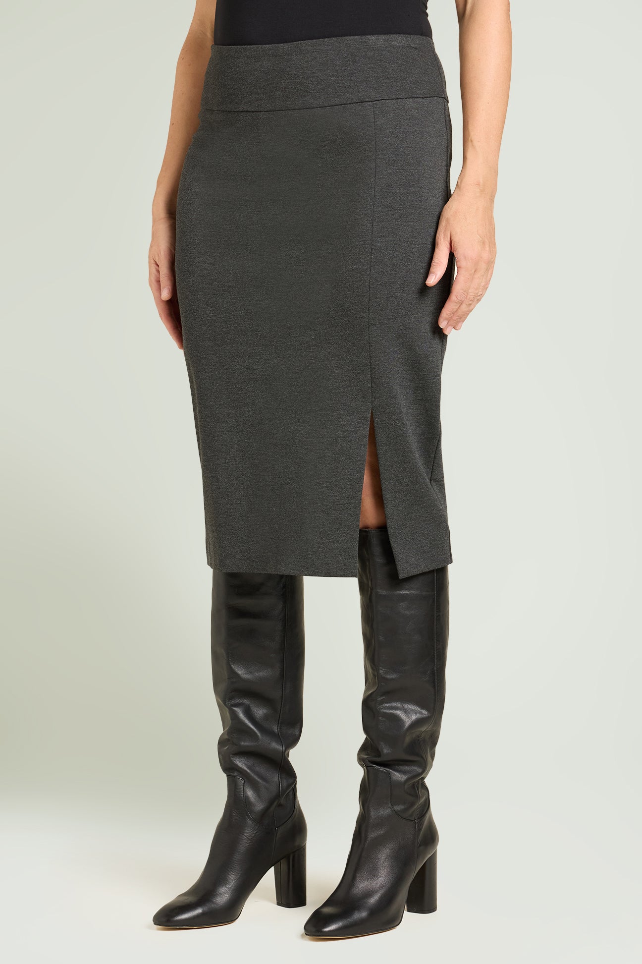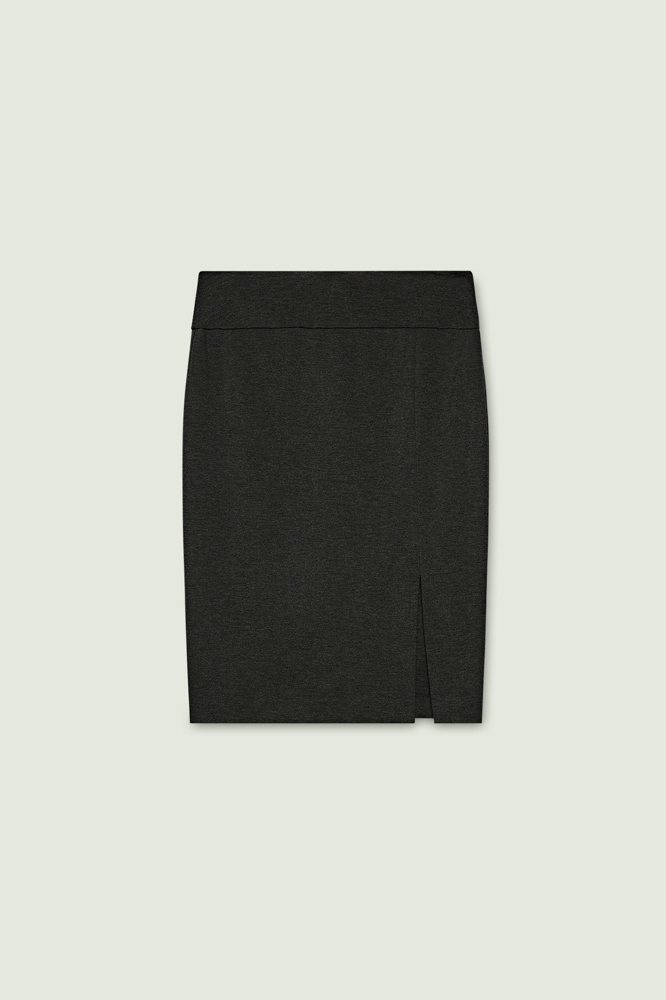Gonna elasticizzata in Punto Milano. Linea dritta che va a chiudere leggermente verso il fondo. Baschina estensibile con costruzione "Pull-On", zenza zip. Spacco su lato sinistro, sfoderata.