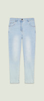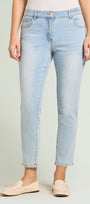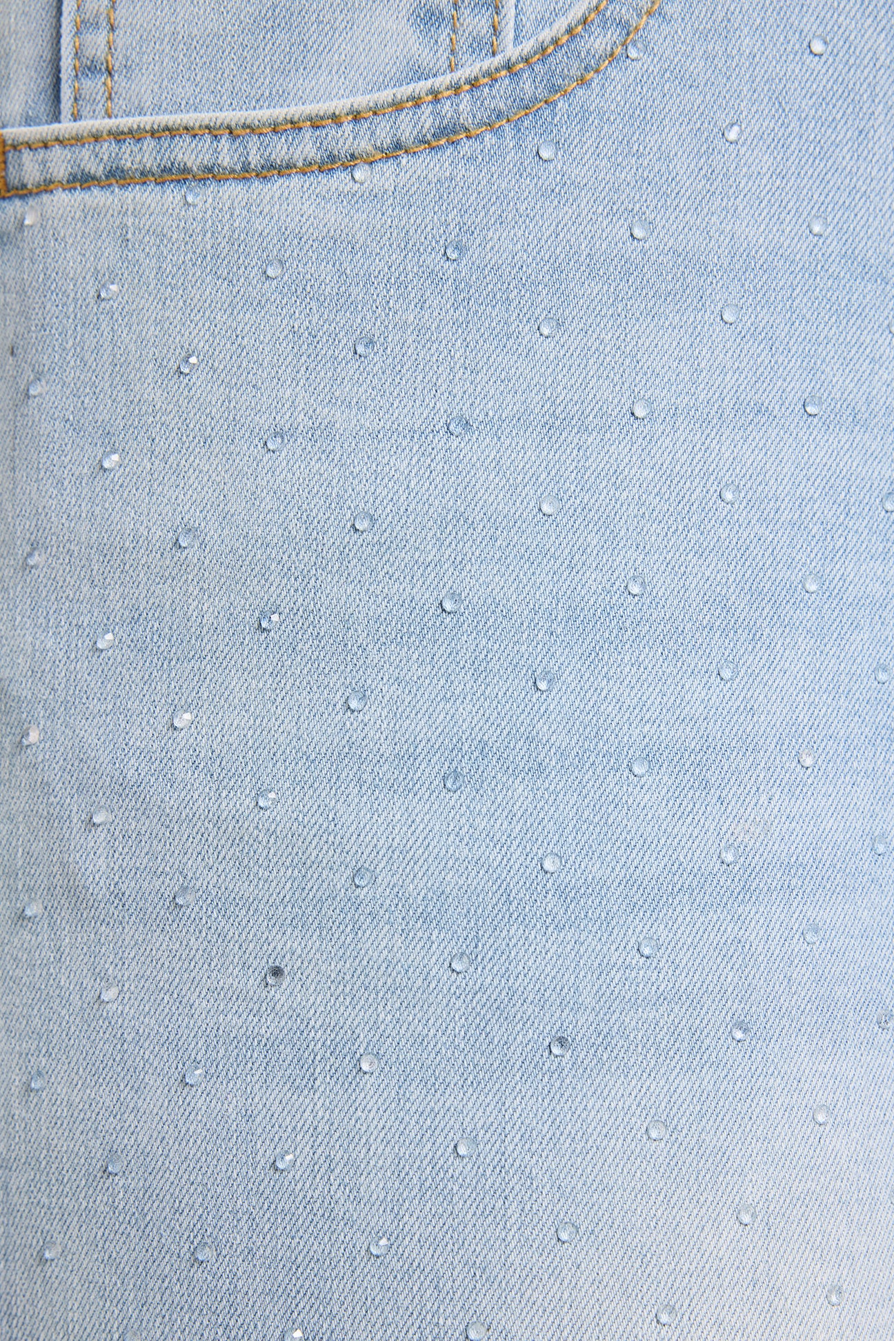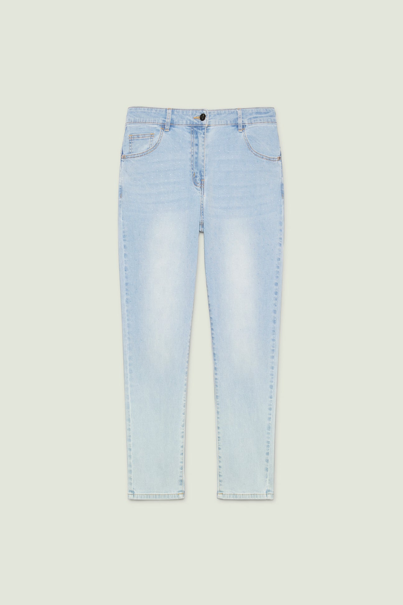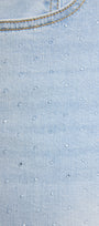Pantaloni 5 tasche in denim stretch (10,5 once) dalla linea skinny caratterizzati da una raffinata pioggia di borchiette trasparenti ad effetto goccia. Tessuto elasticizzato, cintura in forma con lavorazione estensibile e passanti, chiusura davanti con zip nascosta e bottone, dietro con baschina push-up. Trattamento stone bleached azzurro con leggere sabbiature, impunture coccio. Dettagli "light gold" con il logo "V" di Luisa Viola.