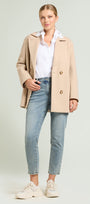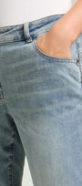 Pantaloni cinque tasche in Denim stretch (10 once), dalla linea Skinny. Punto vita leggermente abbassato, cintura in forma con lavorazione estensibile e passanti, chiusura davanti con zip nascosta e bottone, dietro con baschina push-up. Trattamento stone washed con leggere sabbiature, impunture cammello. Bottone e rivetti gunmetal con il logo "V" di Luisa Viola.