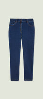 Pantaloni cinque tasche in denim stretch (11 once), dalla linea skinny. Punto vita leggermente abbassato, cintura in forma con lavorazione estensibile e passanti, chiusura davanti con zip nascosta e bottone, dietro con baschina push-up. Trattamento stone washed, impunture coccio. Dettagli light gold con il logo "V" di Luisa Viola.