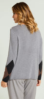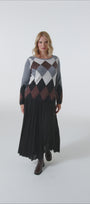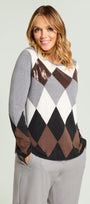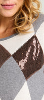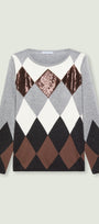 Soffice maglia con punto rasato in finezza 12 e bordi in costa, caratterizzata da un intarsio che forma un "argyle" degradè nei toni del grigio, nero, marrone e avorio, impreziosito da un intervento di nicropaillettes.
