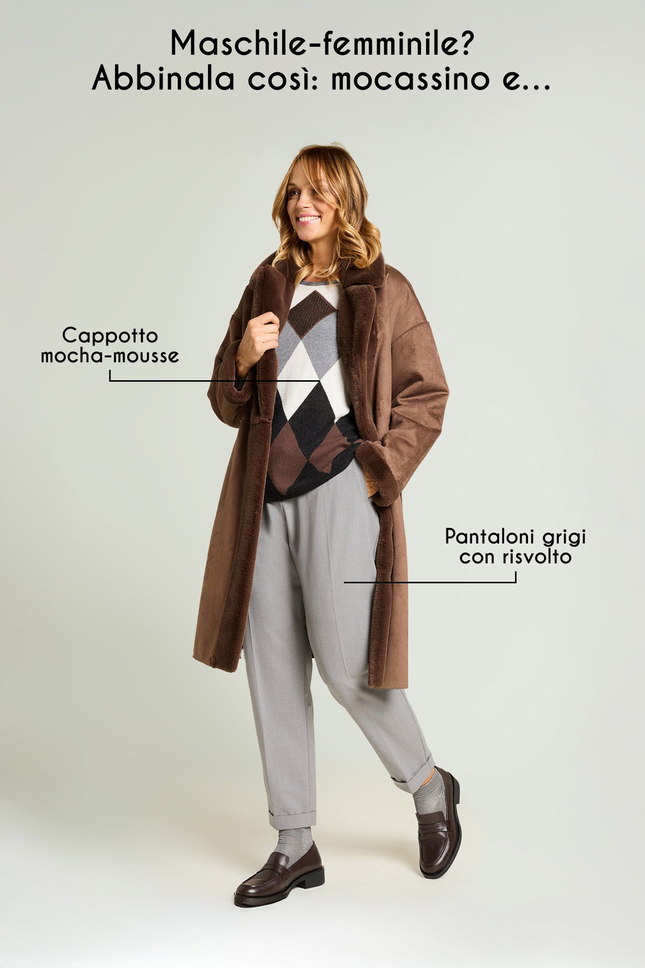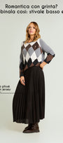 "Argyle" indica il celebre motivo a rombi o losanghe usato in maglieria, e prende appunto il nome dalla città di Argyle, situata nelle Highland scozzesi, da dove si è poi diffuso. Adottato dalla famiglia reale britannica, spesso associato a sport anglosassoni, ha poi iniziato ad essere presente sulle passerelle di moda nelle piu' svariate interpretazioni. Luisa Viola lo ripropone fondendo il maschile al femminile con una maglia protagonista facilmente abbinabile.