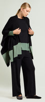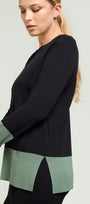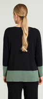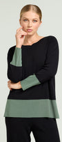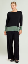 Maglia in viscosa comfort dalla linea dritta con spacchi laterali, nera con color block verde salvia. Scollatura a barchetta, finezza 14, punto compatto a costine con una confortevole elasticità. Abbinabile anche a completo con pantaloni nello stesso filato.