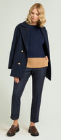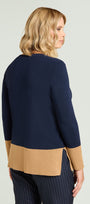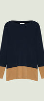 Maglia in viscosa comfort dalla linea dritta con spacchi laterali, blu con color block cammello. Scollatura a barchetta, finezza 14, punto compatto a costine caratterizzato da una confortevole elasticità.