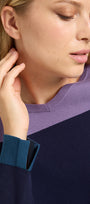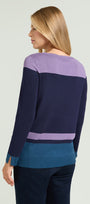 Maglia in viscosa comfort con blocchi di colori moda posizionati in modo armonico. Finezza 12, punto rasato con bordi in costa, scollo a "V" alto, polsi con spacchetti.