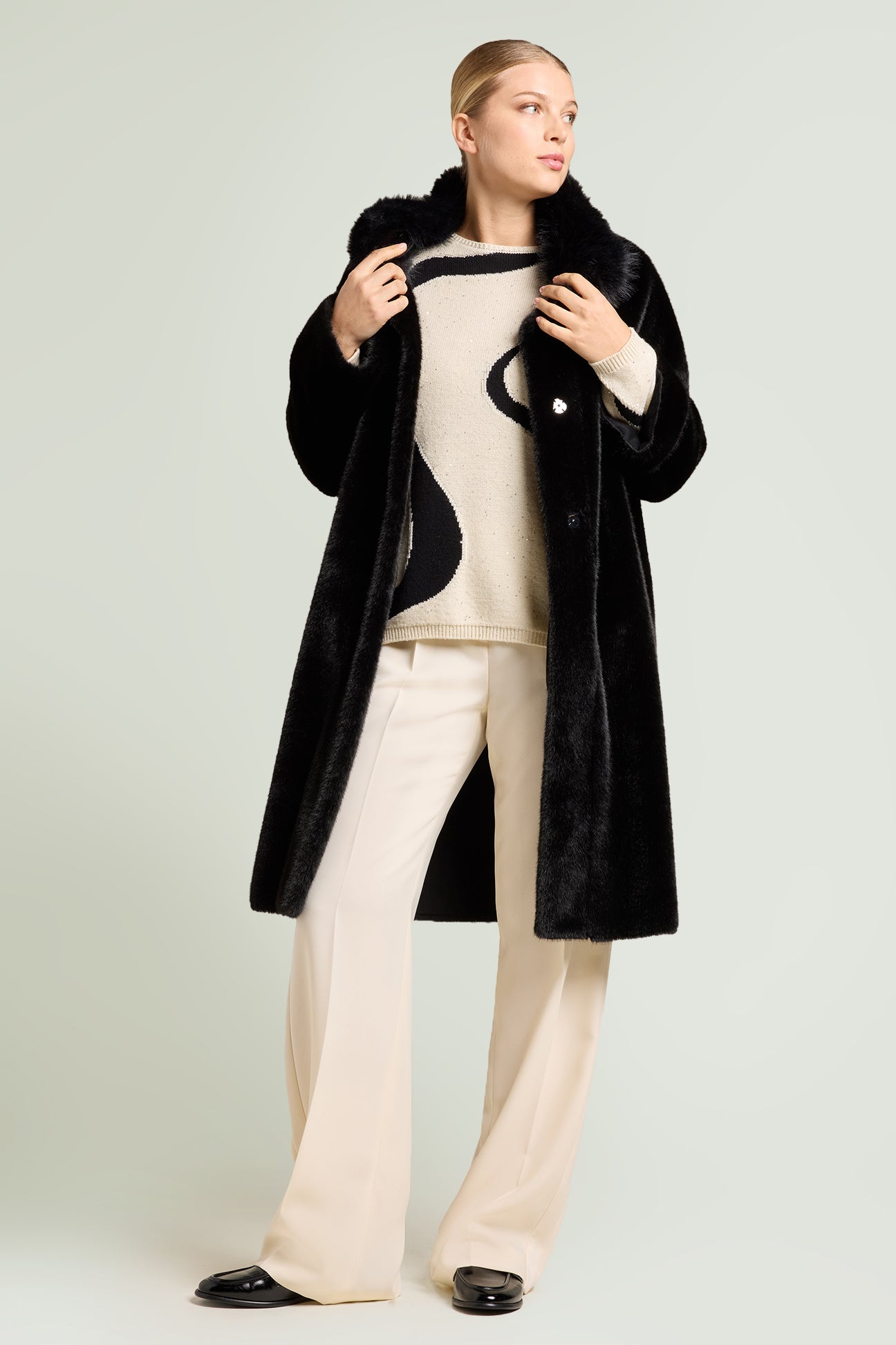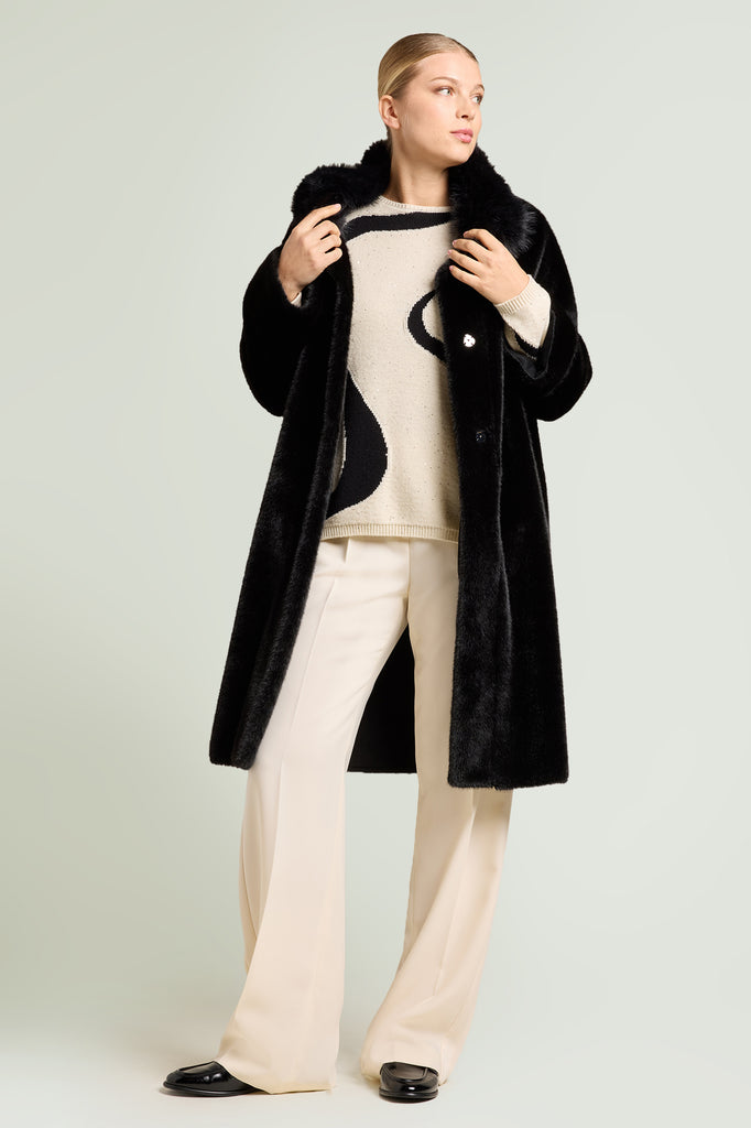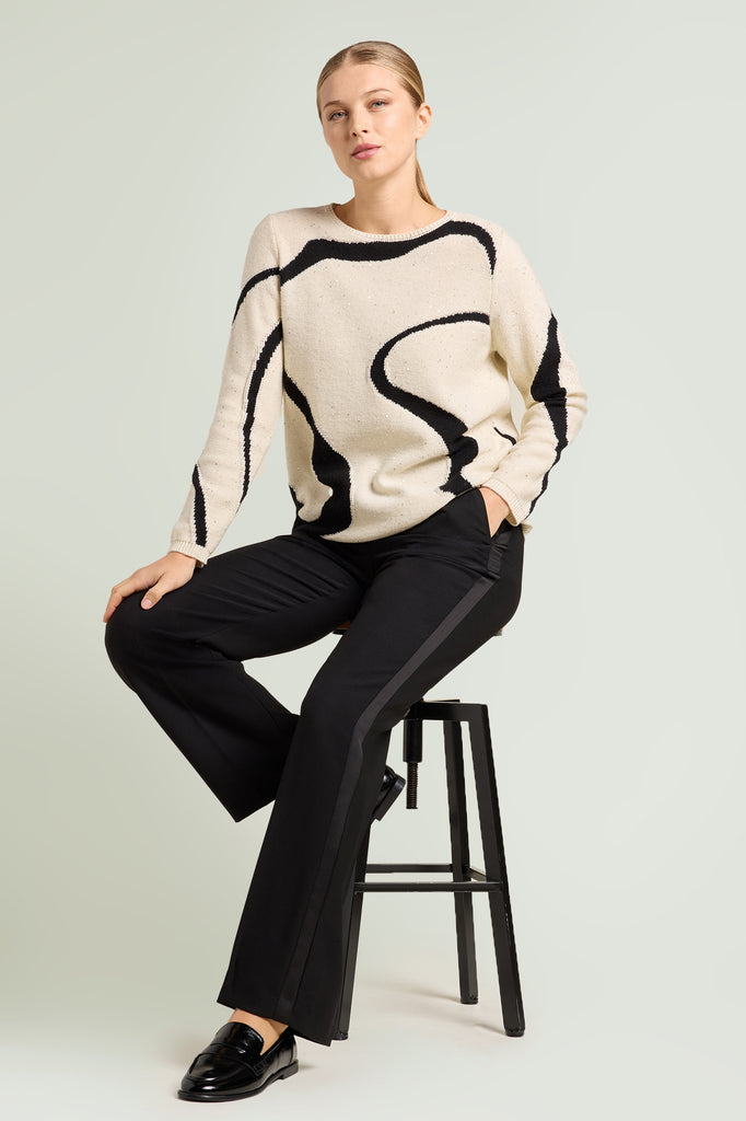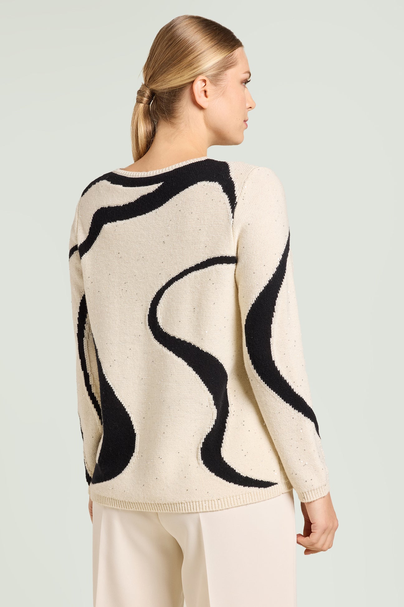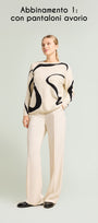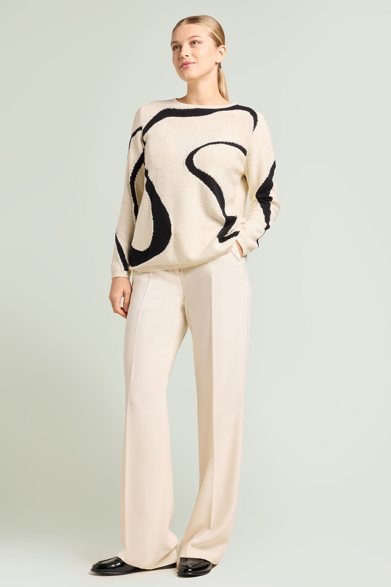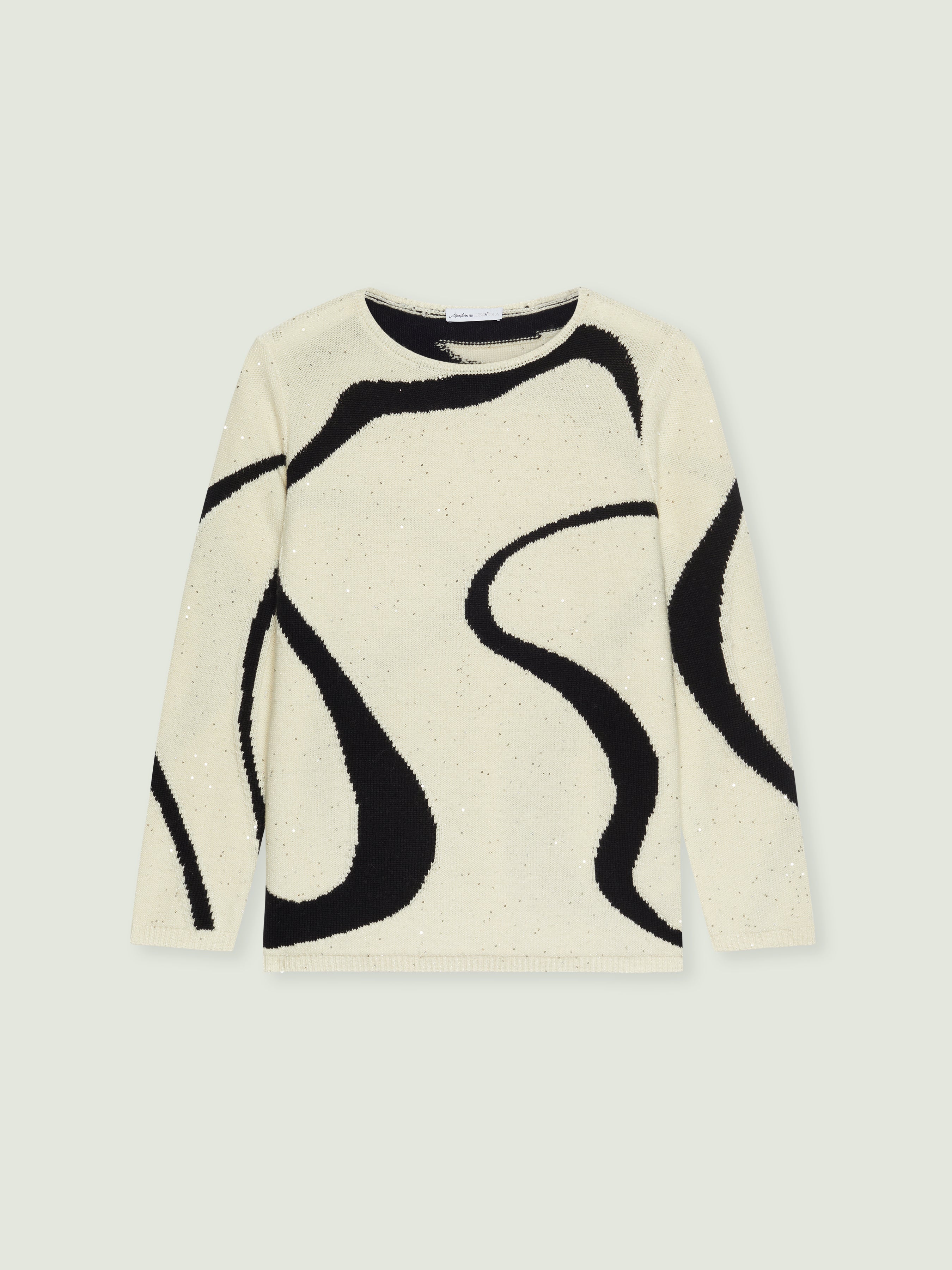 Una "maglia capolavoro" con un'elaborata lavorazione ad intarsio, dove la lana si alterna ad un soffice filato impreziosito da micro pailllettes. Scollo a barchetta, punto rovescio in finezza 7 con bordi in costa.