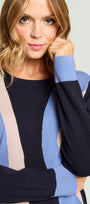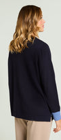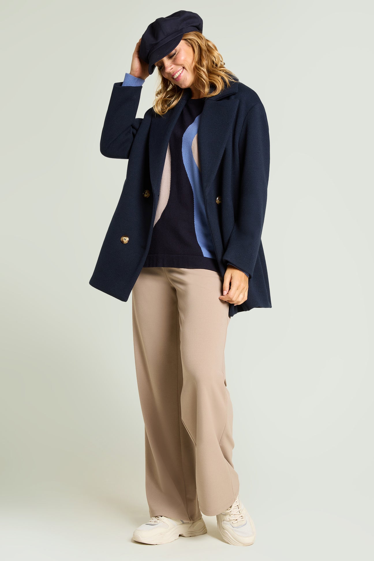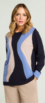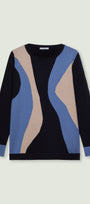 Maglia fantasia in viscosa comfort winter-touch, punto rasato in finezza 12 con bordi in costa, scollatura rotonda. Elaborato intarsio sul davanti con grafica ad onde nei toni blu navy, azzurro e sabbia.