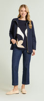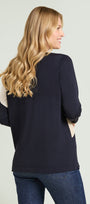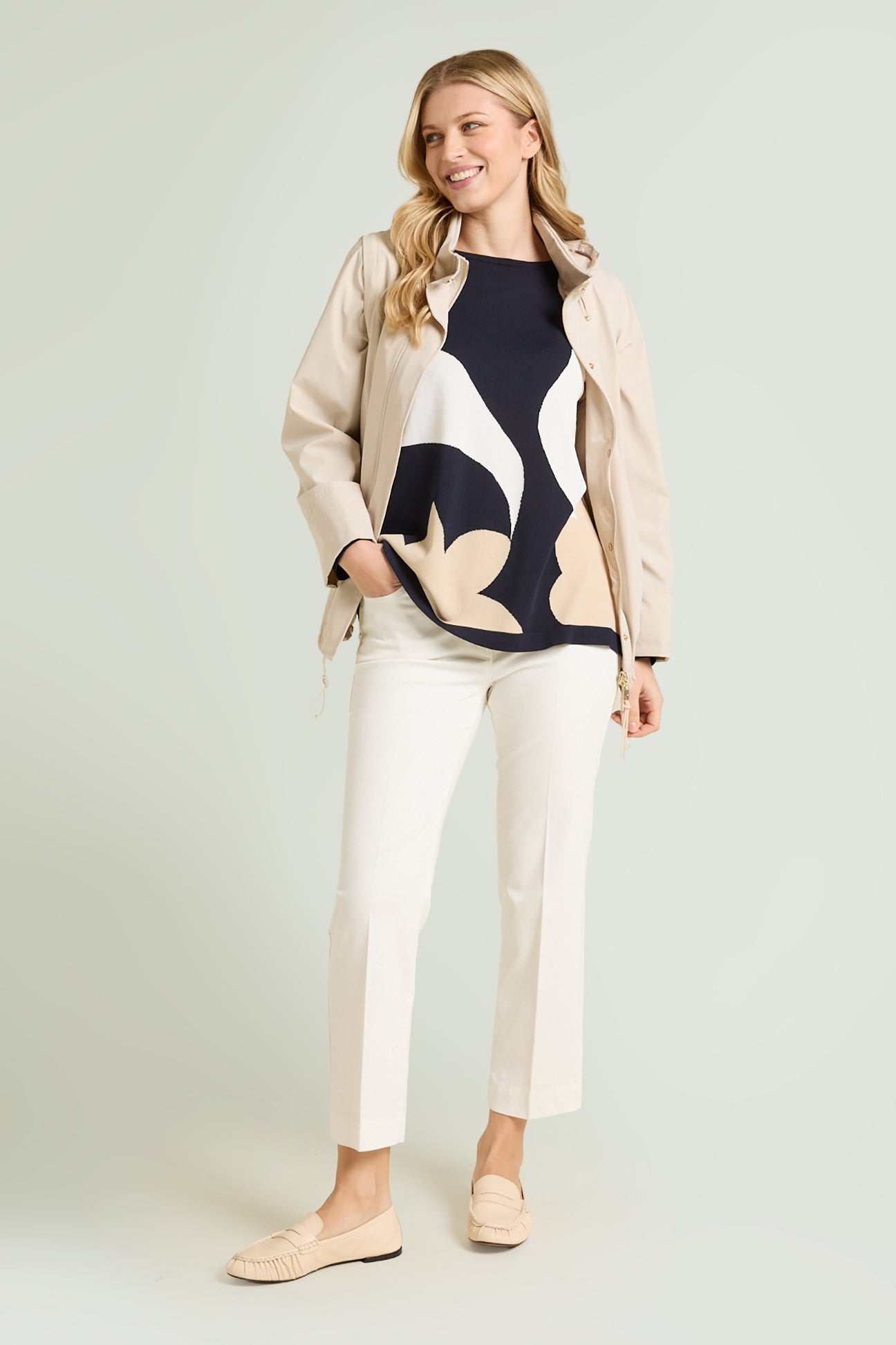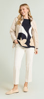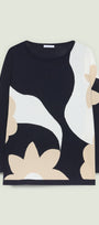 Maglia fantasia realizzata in un filato di viscosa dalla mano fresca. Scollo a barchetta, punto rasato in finezza 14 con intarsio. Giromanica con calature.