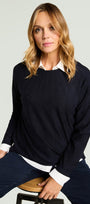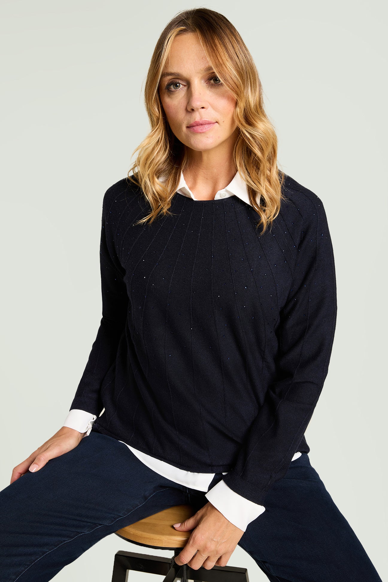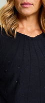 Maglia in viscosa comfort caratterizzata da una lavorazione particolare che crea raggi di nervature soleil che si irradiano partendo dalla scollatura. Finezza 14, punto rasato con bordi in costa. Pioggia di piccoli punti luce sul davanti, tono su tono.