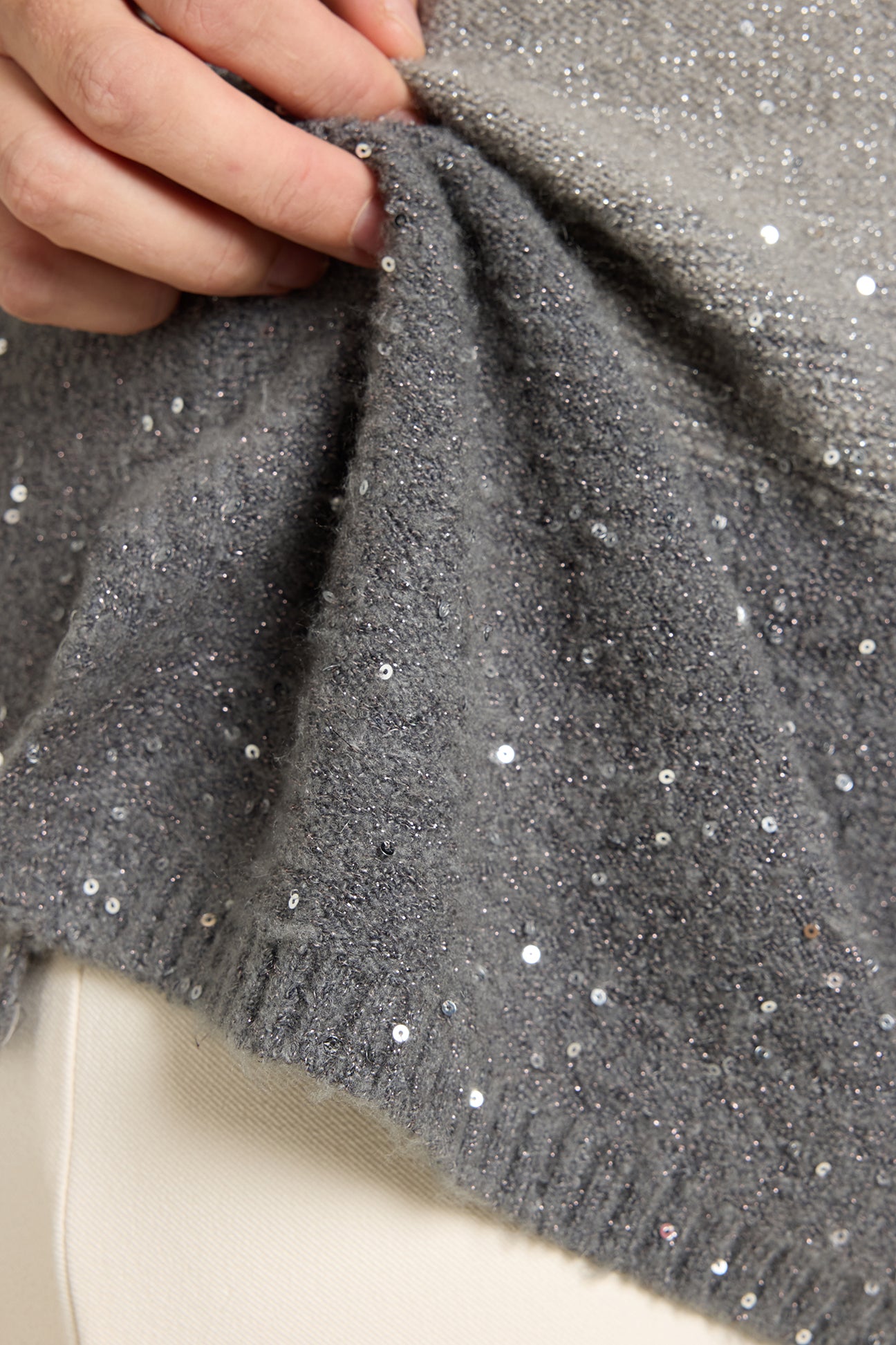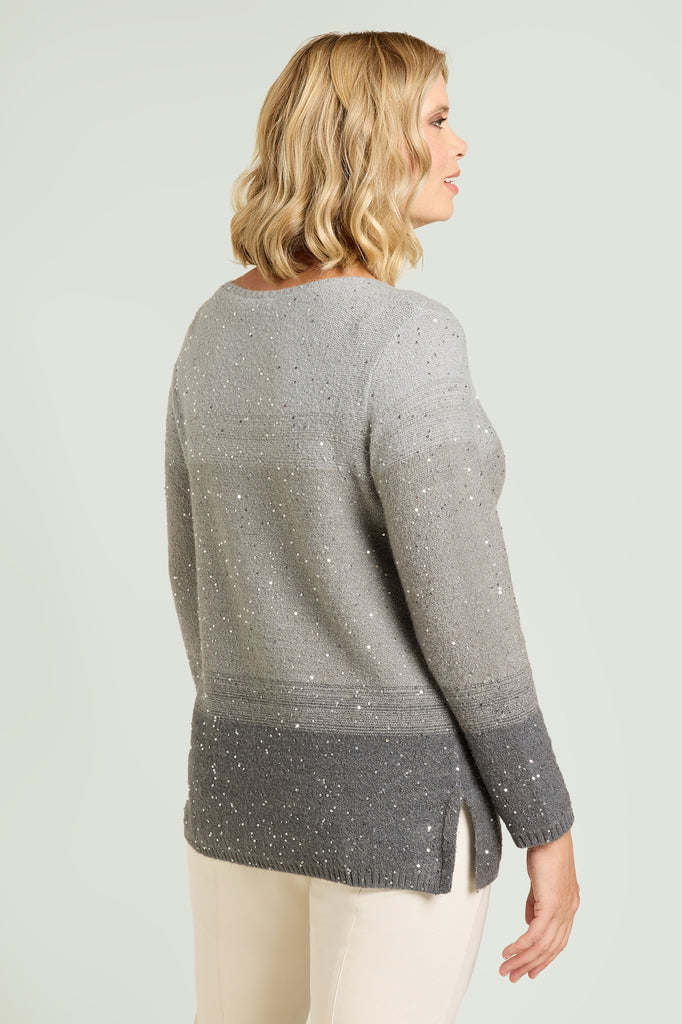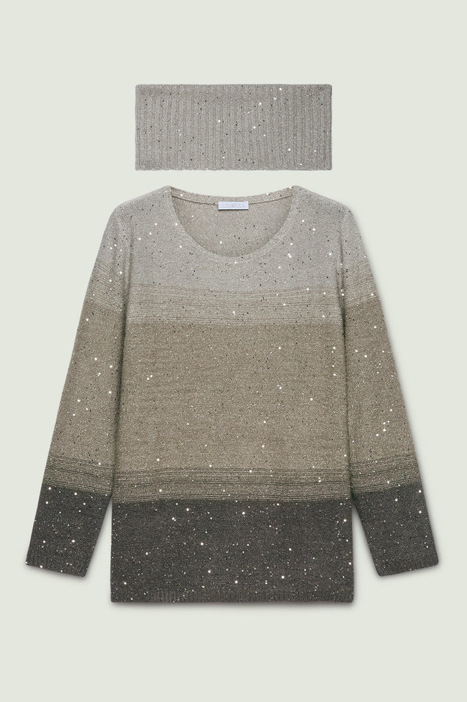 Maglia soft touch in filato full-paillettes con motivo degradè in camaieux di grigi. Punto rovescio in finezza 7 con bordi in costa. Scollatura rotonda con collo ad anello staccabile.