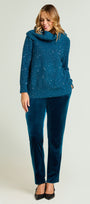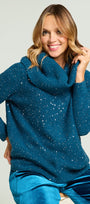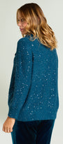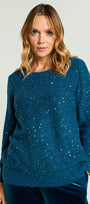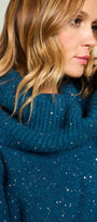 Maglia soft touch in filato full-paillettes. Punto rovescio in finezza 7 con bordi in costa. Scollatura a barchetta con collo ad anello staccabile.