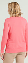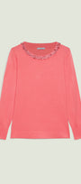 Maglia in viscosa comfort caratterizzata da un prezioso ricamo di castoni in vetro applicati a mano sulla scollatura. Punto rasato in finezza 12 con bordi in costa. Linea dritta con spacchetti laterali. Giromanica con calature.