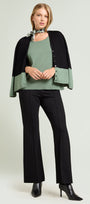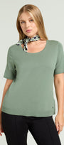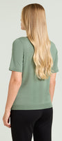 Maglia girocollo in viscosa comfort nel nuovo tono verde salvia. Punto rasato in finezza 12 con bordi in costa, manica corta con calature.