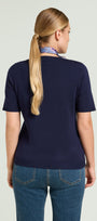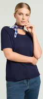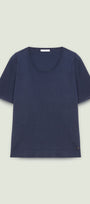 Maglia girocollo in viscosa comfort. Punto rasato in finezza 12 con bordi in costa. Manica corta con calature, abbinabile a twin set con i nostri cardigan realizzati nello stesso filato.