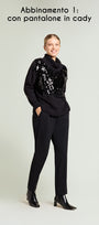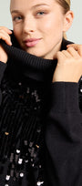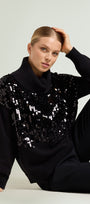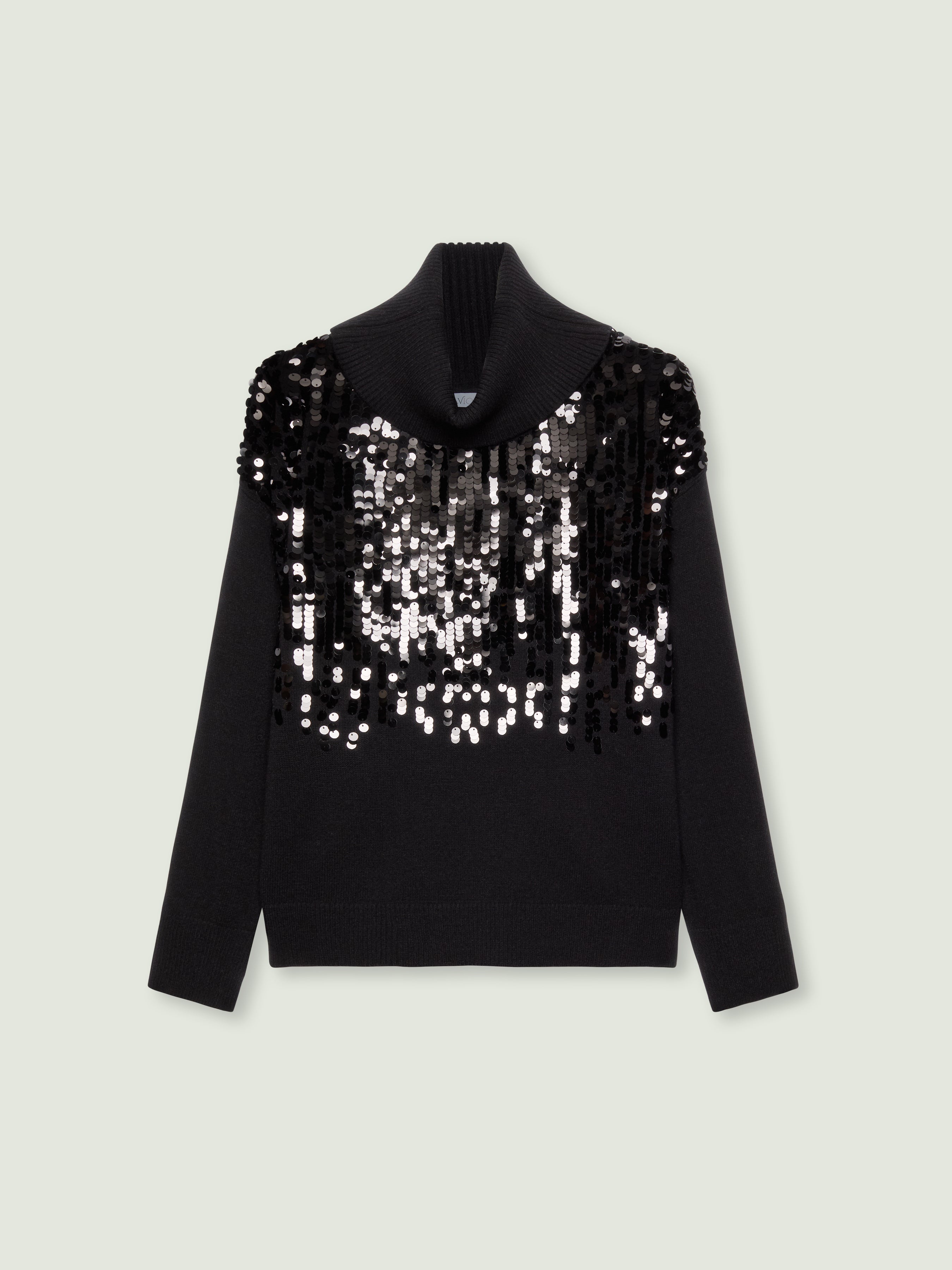 Maglia realizzata in un confortevole filato winter touch. Punto rasato in finezza 7 con bordi in costa, scollo a barchetta con collo ad anello staccabile. Ricamata con maxi-paillettes in tinta.