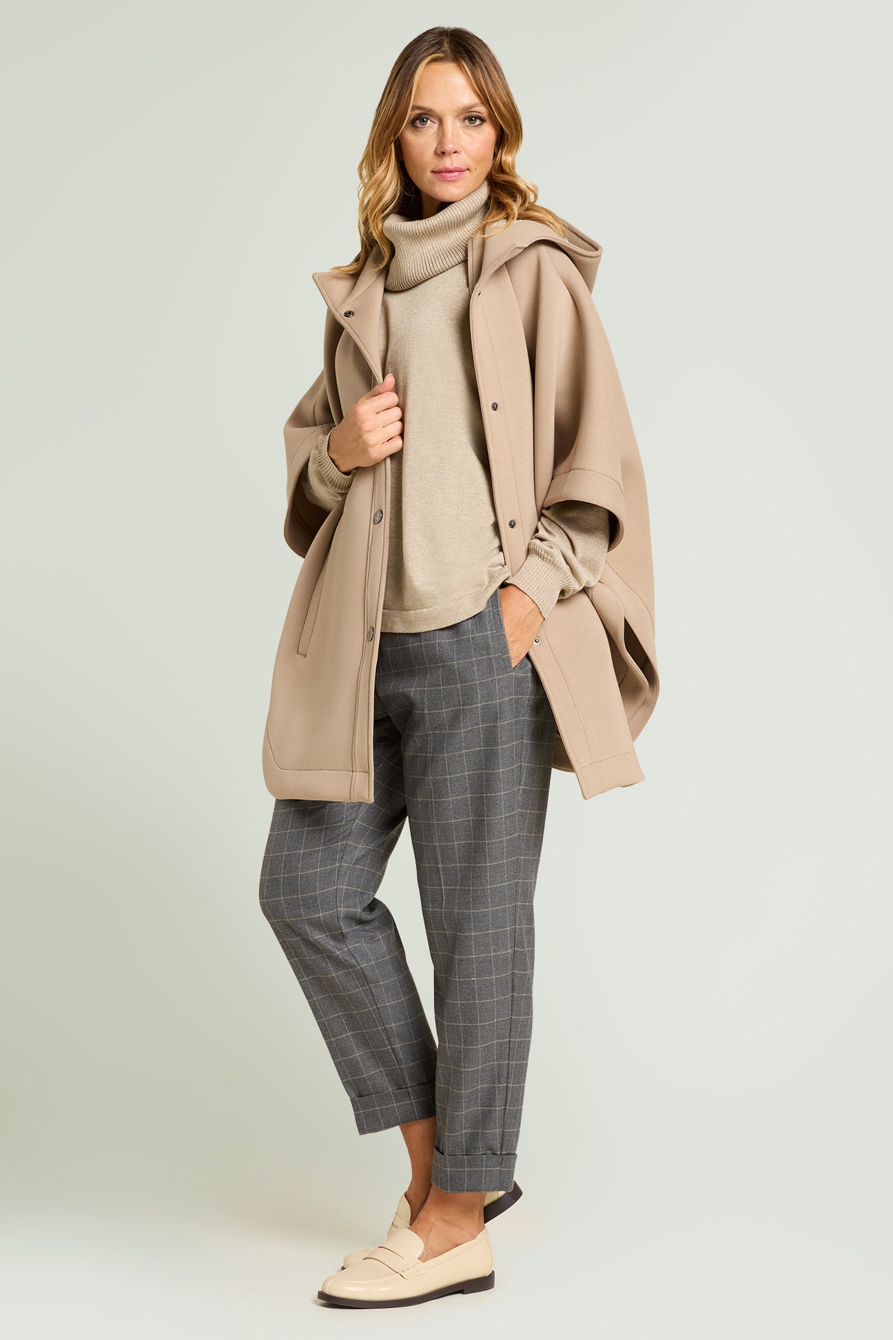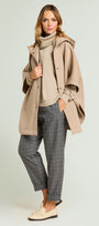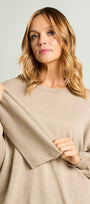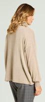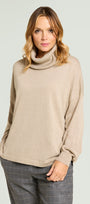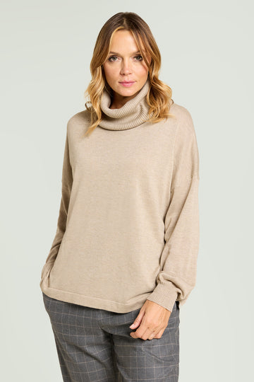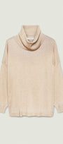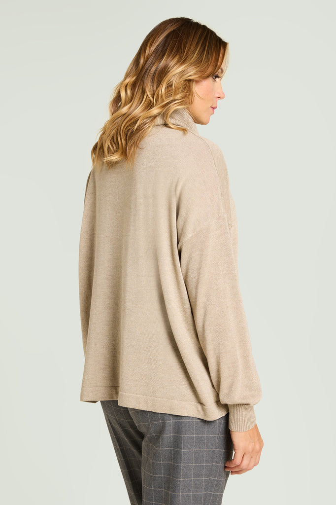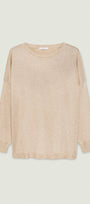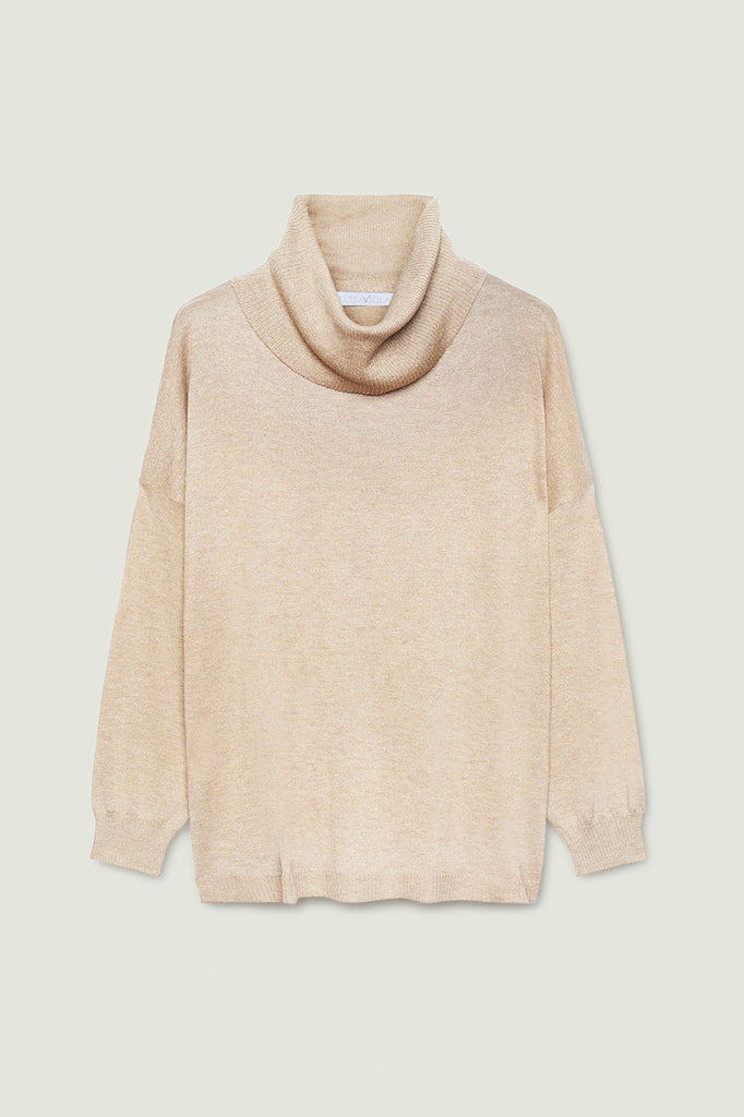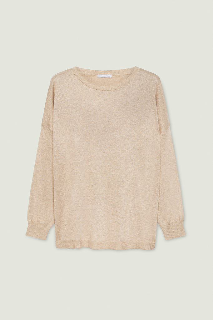 Maglia con vestibilità comoda realizzata in un filato melange leggero e luminoso, dove il color sabbia è lavorato in moulinè con un sottile filo argento. Finezza 12, punto rasato con bordi in costa. Scollatura rotonda con collo ad anello staccabile.