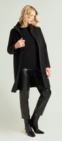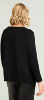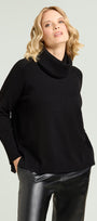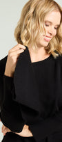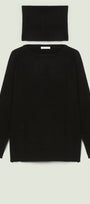 Maglia in viscosa comfort dalla linea comoda con spacchi laterali sovrapposti. Punto rasato in finezza 7 con bordi in costa, taglio raglan con calature, scollatura rotonda e collo ad anello staccabile. Disponibile in nero e in un donante punto di azzurro.