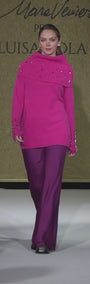 Soffice maglia in finezza 7, realizzata in un donante tono di fucsia. Caratterizzata da un ampio collo ad anello portabile in diversi modi, è impreziosita da una pioggia di castoni in vetro porpora su scollo e fondo manica. Ricamata a mano.