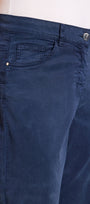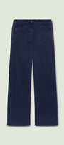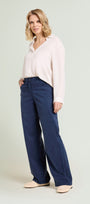 Pantaloni 5 tasche in rasatello fluido dalla linea ampia. Tessuto stretch. Punto vita leggermente abbassato, cintura in forma con lavorazione estensibile e passanti, chiusura davanti con zip nascosta e bottone. Bottone e rivetti "light gold" con il logo "V" di Luisa Viola.