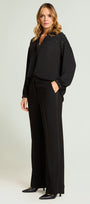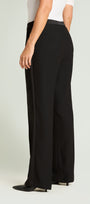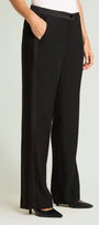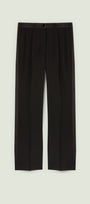 Pantaloni dalla linea ampia in cady crepe enver satin. Punto vita regolare, cinturino estensibile con gros grain elastico inserito nel tratto dietro. Chiusura davanti con zip nascosta e bottone, banda laterale in raso, piega stirata.
