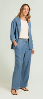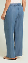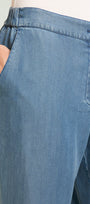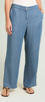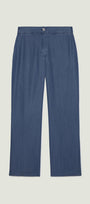 Pantaloni fluidi in chambray con gamba dritta e lunghezza alla caviglia. Punto vita regolare, cinturino estensibile con gros grain elastico inserito nel tratto dietro, chiusura davanti con zip nascosta e bottone. Tasche all'americana. Trattamento stone washed. Facilmente abbinabili, si possono anche indossare a completo con capi realizzati nello stesso tessuto.