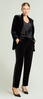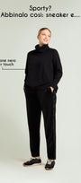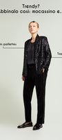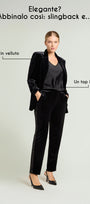 "La tua vita non è mai stata così comoda": pratici e confortevoli, con la loro vita elasticizzata senza zip, i Pull-On di Luisa Viola sono realizzati in diversi tessuti, colori e fit. In velluto è disponibile in due versioni: con fit Ampio e con fit Jogger più banda in paillettes.
