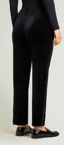 Pantalone realizzato in un confortevole velluto elasticizzato con bande laterali in paillettes. Fit Jogger, cinturino estensibile con coulisse e gros grain elastico inserito all'interno, tasche all'americana. Costruzione Pull-On.