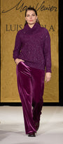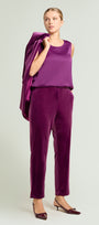 Come insegna la tradizione sartoriale, il capo è tagliato con la direzione del velluto rivolta verso l'alto, in modo da ottenere un effetto uniforme del tessuto, un colore più intenso e un aspetto prezioso. Disponibile in nero e in due colori moda: porpora e blu pavone. Abbinabile anche a tailleur con blazer nello stesso tessuto.