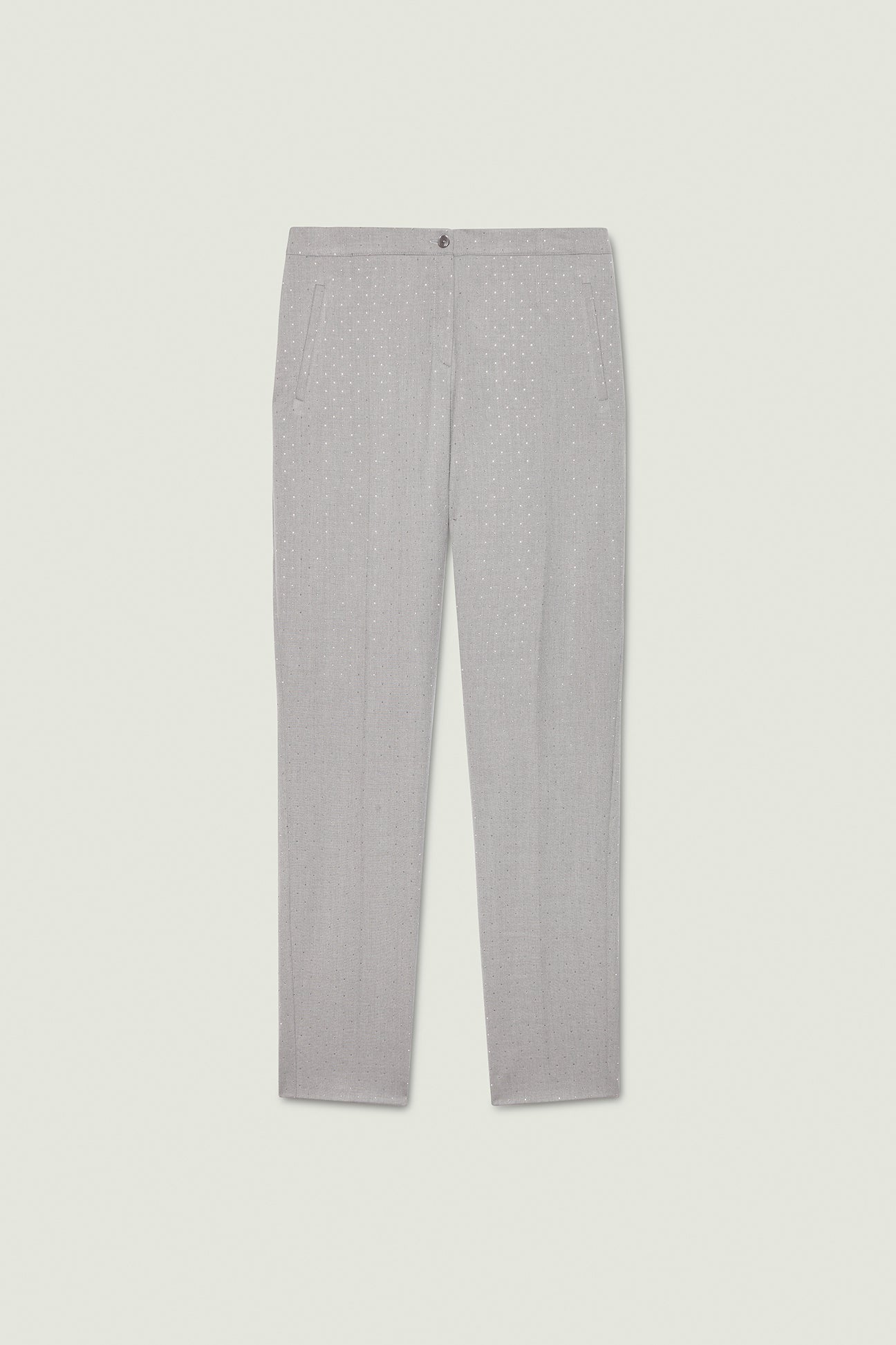 Pantaloni con fit Sigaretta realizzato in un tessuto melange caratterizzato da una pioggia di micro borchiette sfaccettate. Tessuto stretch, punto vita regolare, chiusura davanti con zip nascosa e bottone, cintura estensibile con elastico inserito nel tratto dietro, tasche a filetto, piega stirata.