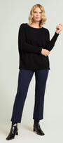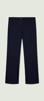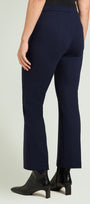Pantaloni kick Flare in Punto Stoffa stretch con vestibilità "No-Hips". Punto vita regolare, cinturino con lavorazione estensibile, chiusura davanti con zip nascosta e bottone, piega stirata.