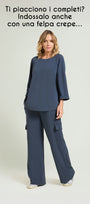 Pantaloni cargo in tessuto super-stretch: uno "scuba crepe" dalla caduta fluida caratterizzato da un rovescio raso che dona una piacevole sensazione sulla pelle. Linea ampia, punto vita regolare, cintura estensibile con elastico inserito all'interno, tasche all'americana, costruzione Pull-On.