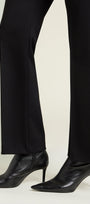 Pantaloni in Punto Milano Stretch con gamba Flare. Punto vita estensibile senza cinturino con gros grain elastico inserito all'interno, nervatura su centro gamba davanti. Costruzione Pull-On.