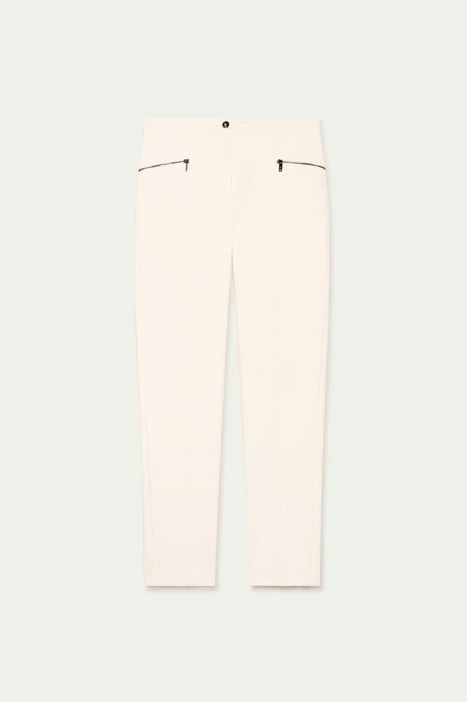 Pantaloni in tessuto tecnico diagonale stretch dalla linea Skinny. Punto vita regolare, cinturino con lavorazione estensibile, chiusura davanti con zip nascosta e bottone, tasche con zip. Tiretti in metallo con finitura "gunmetal", personalizzati con il logo "V" di Luisa Viola.
