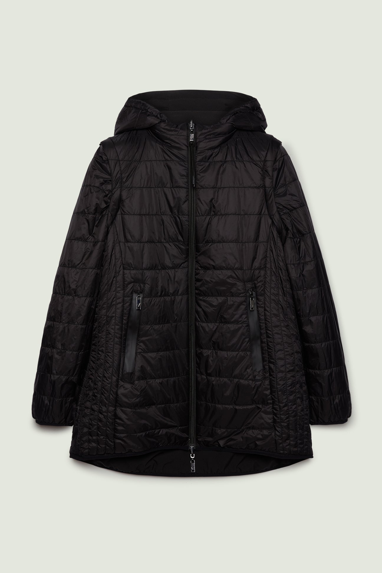 Questo capo fa parte del progetto "I Versatili": capi dinamici e funzionali, pensati per chi cerca flessibilità senza rinunciare allo stile. Grazie alla reversibilità e alle maniche staccabili, è possibile indossarlo in 4 modi diversi, con e senza cappuccio.