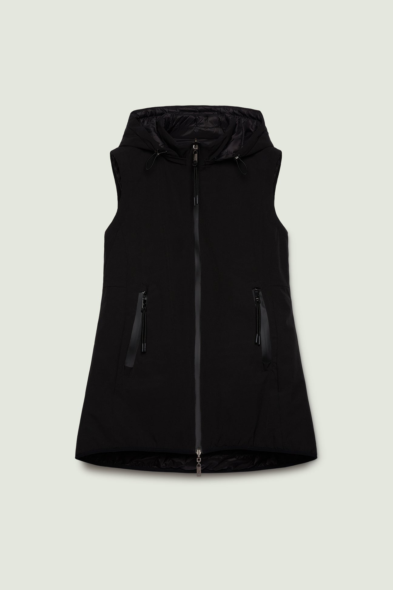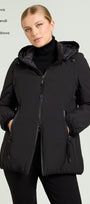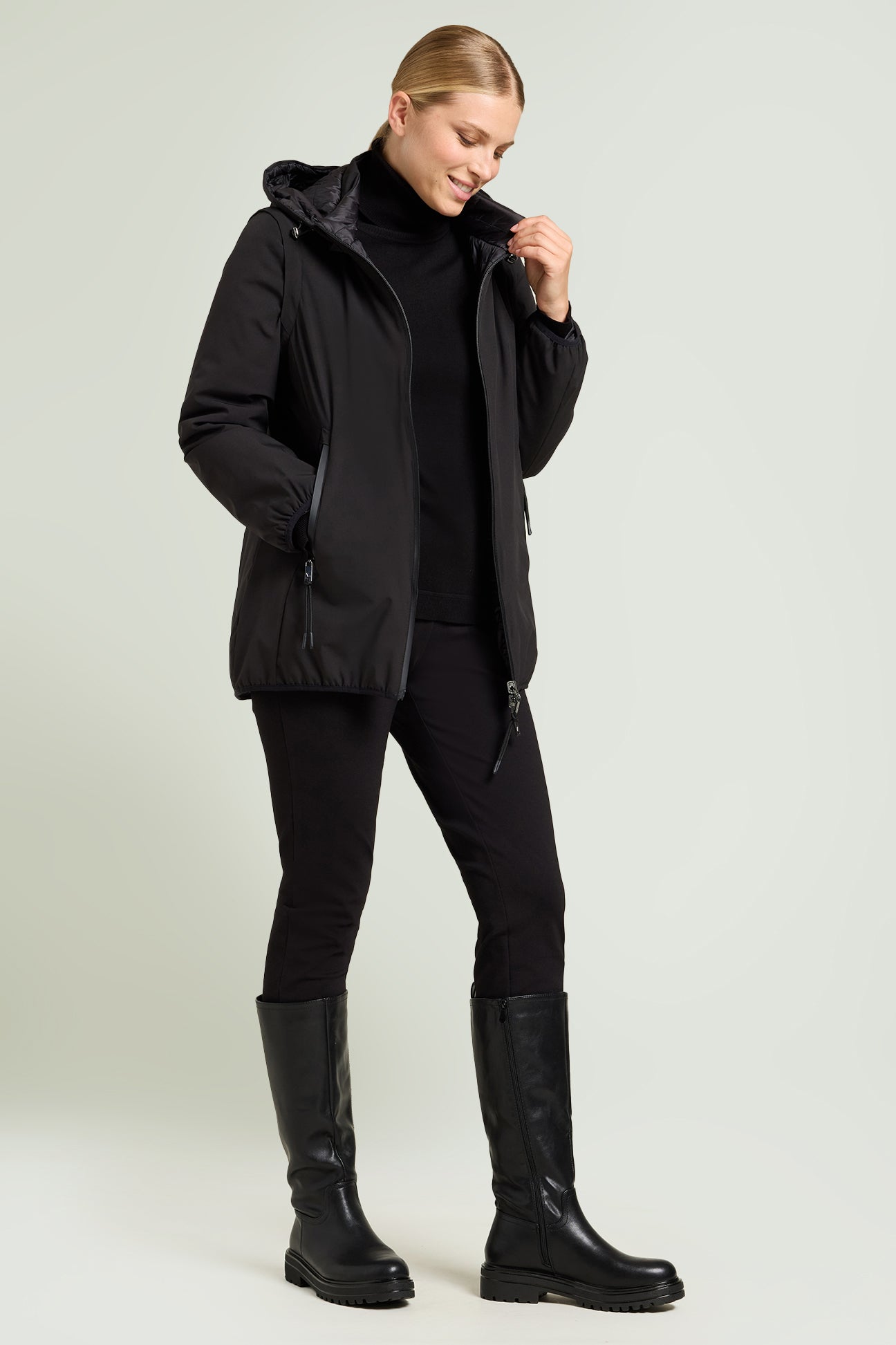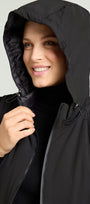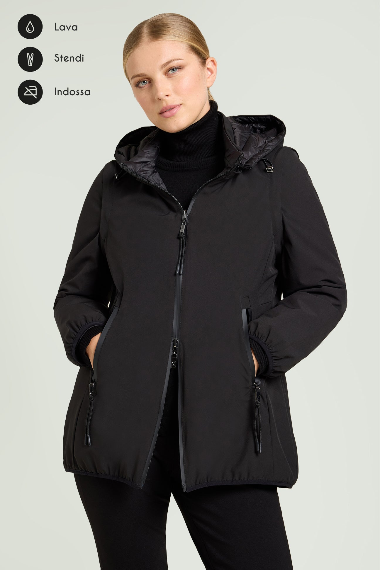 Da un lato è in tessuto tecnico stretch waterproof, color grigio urbano, e dall'altro in nylon trapuntato grigio chiaro. La linea è ergonomica, leggermente sciancrata e piu' lunga sul dietro; chiusura con zip tecnica, doppio cursore, collo a listino, cappuccio e maniche staccabili, coulisse regolabili, laccetti cerati. Cursori in metallo con finitura gunmetal, personalizzati con il logo "V" di Luisa Viola. Disponibile anche nella versione in grigio urbano + grigio chiaro.