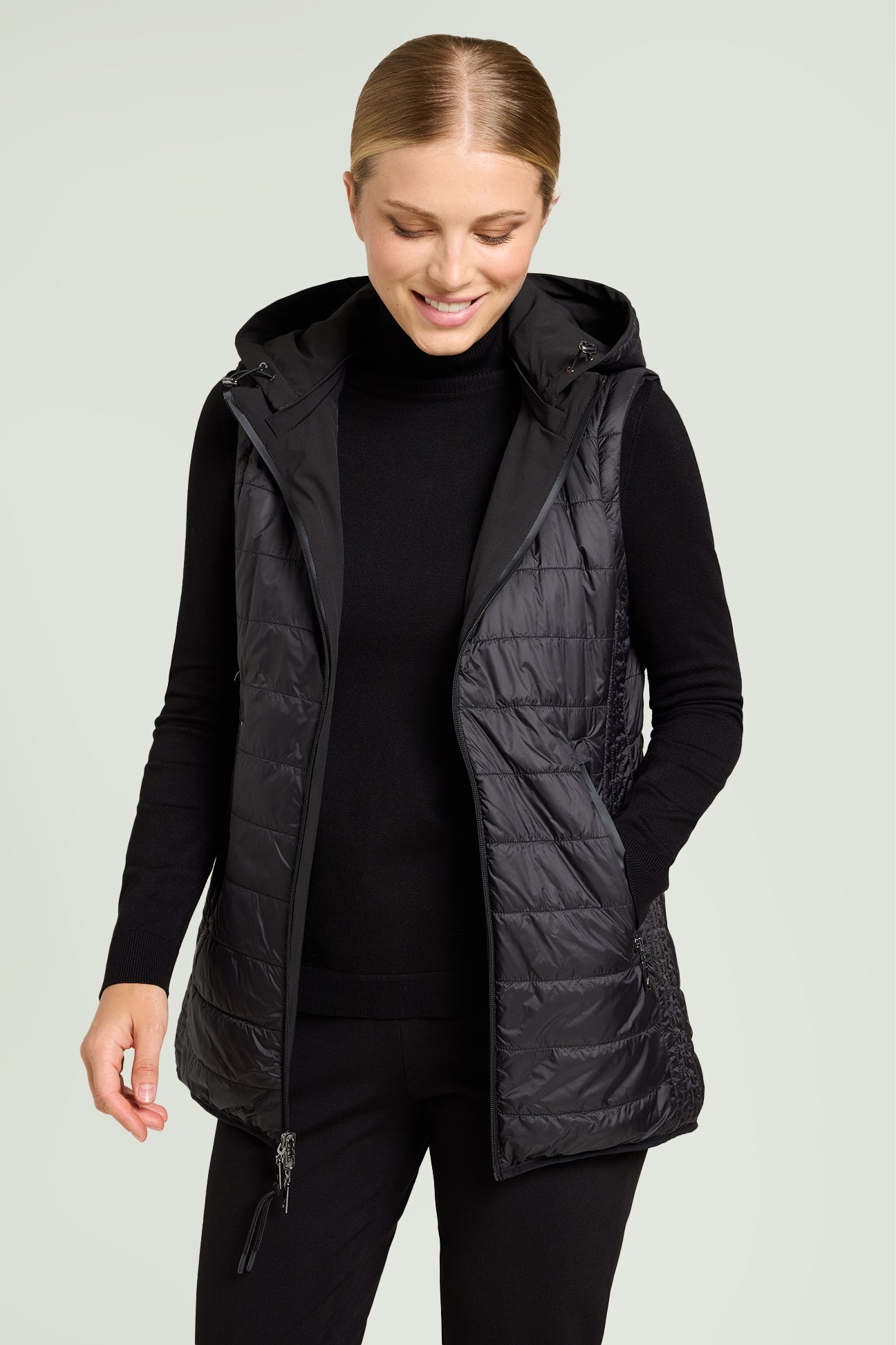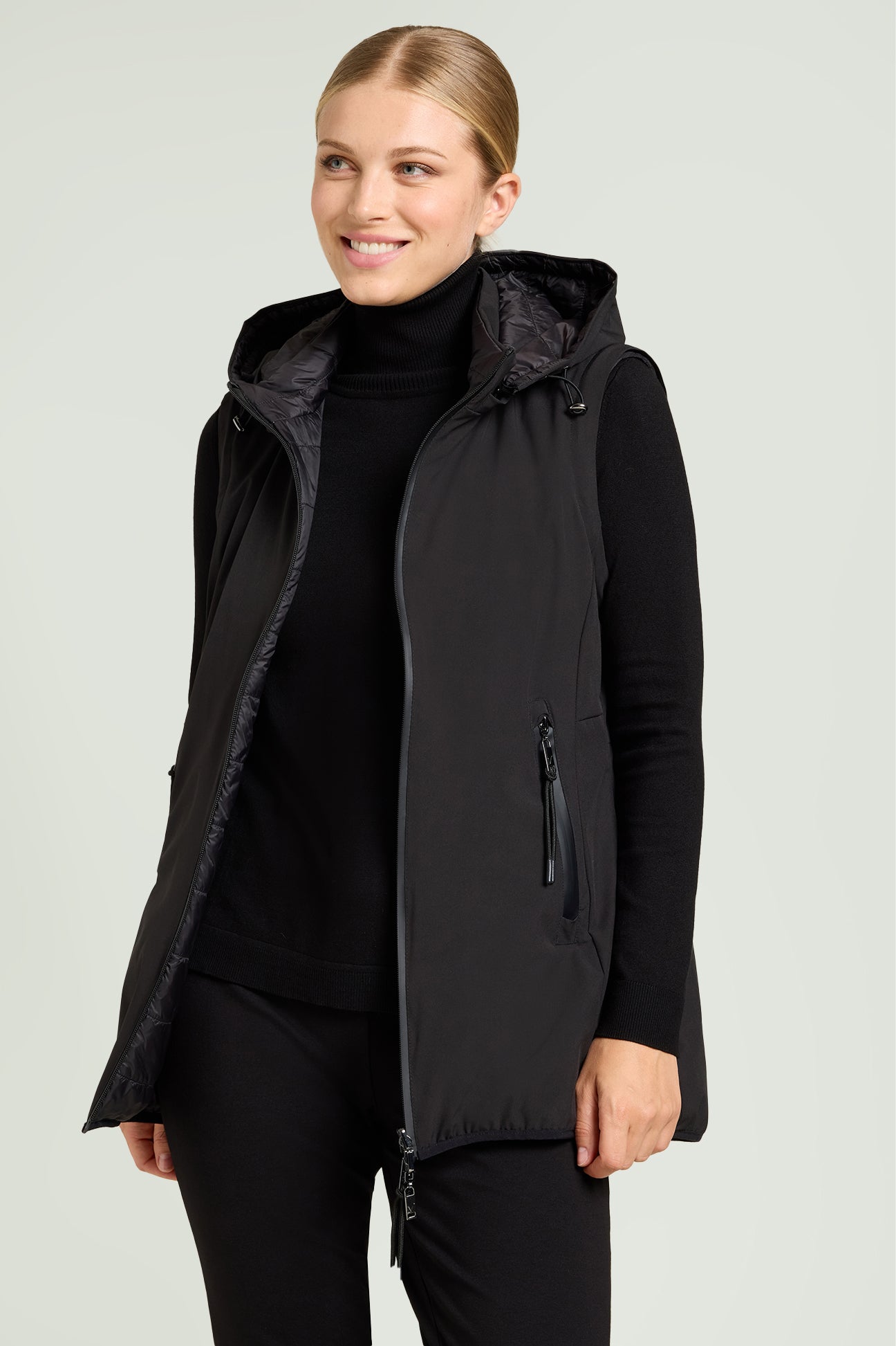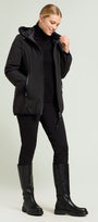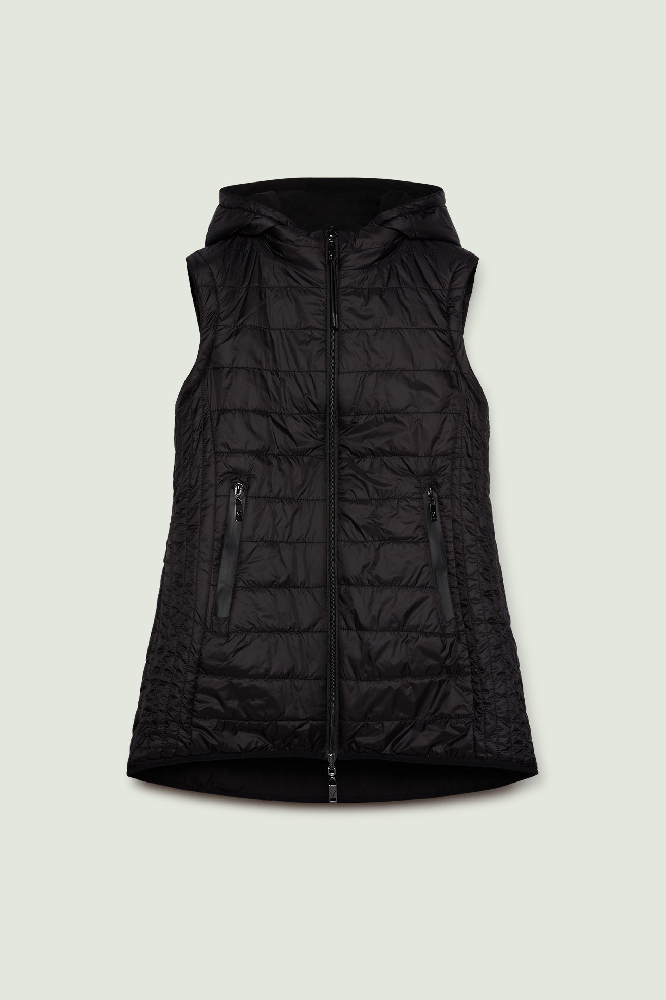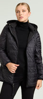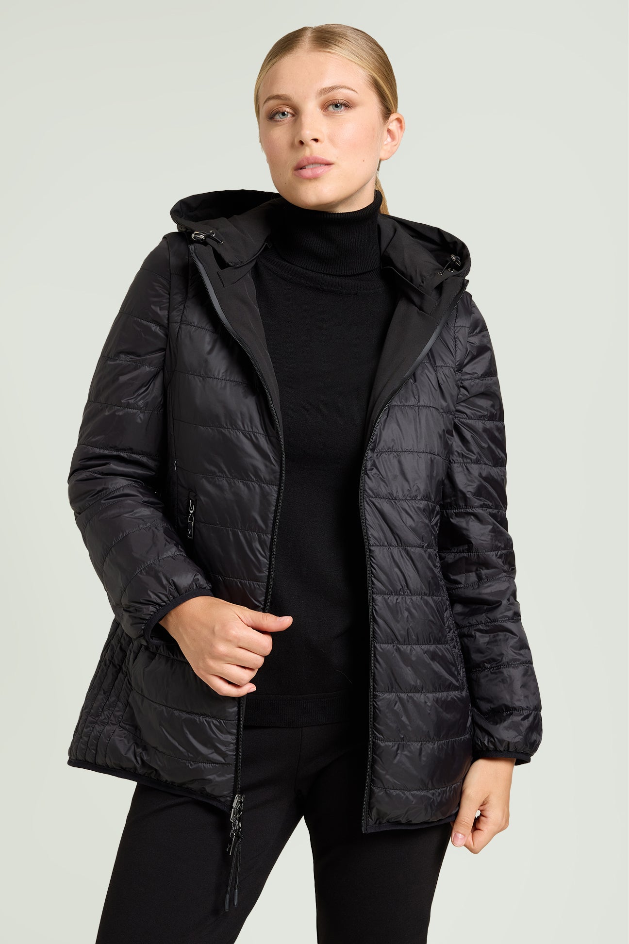 Da un lato è in tessuto tecnico stretch waterproof, color grigio urbano, e dall'altro in nylon trapuntato grigio chiaro. La linea è ergonomica, leggermente sciancrata e piu' lunga sul dietro; chiusura con zip tecnica, doppio cursore, collo a listino, cappuccio e maniche staccabili, coulisse regolabili, laccetti cerati. Cursori in metallo con finitura gunmetal, personalizzati con il logo "V" di Luisa Viola. Disponibile anche nella versione in grigio urbano + grigio chiaro.