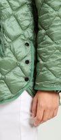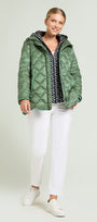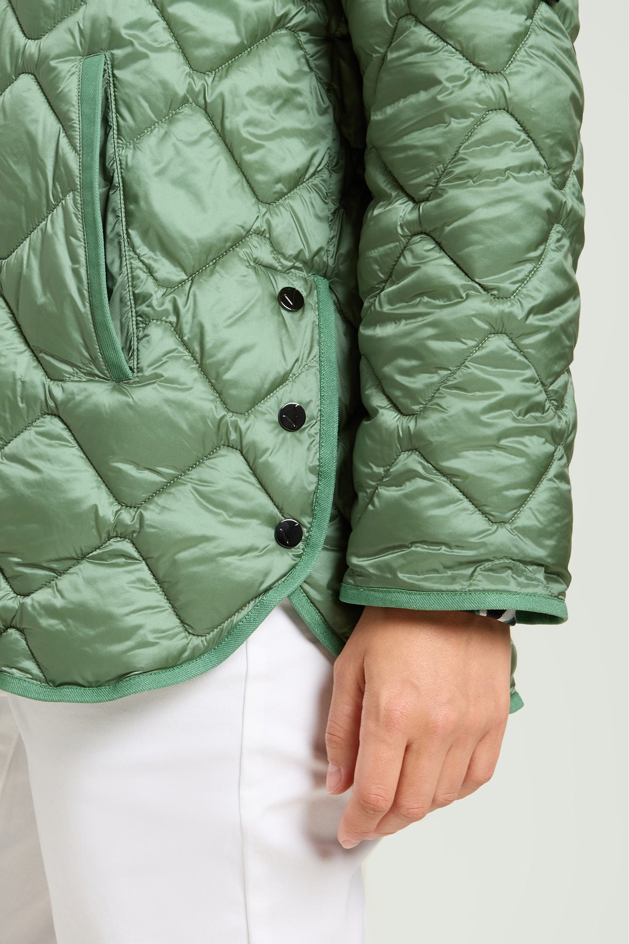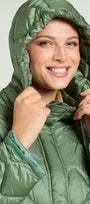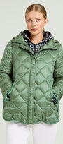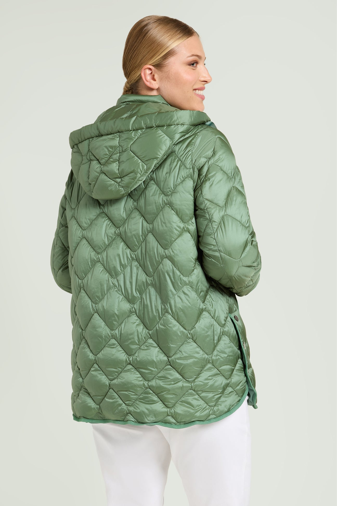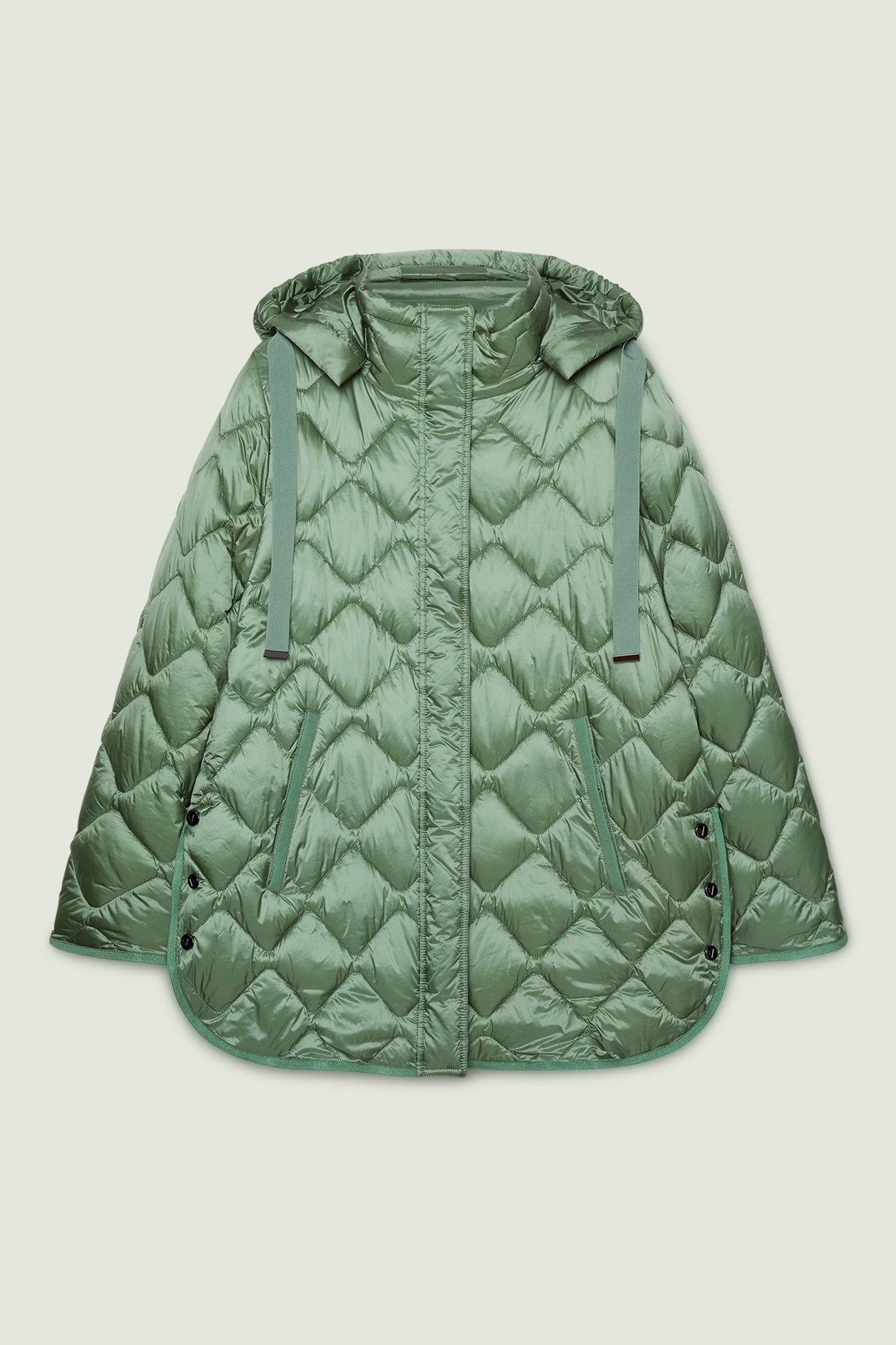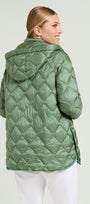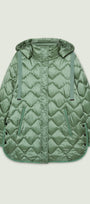 Piumino di peso autunnale in nylon cangiante con imbottitura fake down. Lunghezza media, linea leggermente svasata, spacchi laterali stondati con bottoni. Doppia chiusura con bottoni automatici nascosti e zip con doppio cursore. Tasche a filetto, cappuccio staccabile con coulisse e nastro gros grain. Tiretti e bottoni in metallo con finitura "gunmetal", personalizzati con il logo "V" di Luisa Viola.