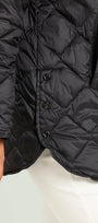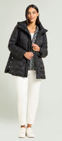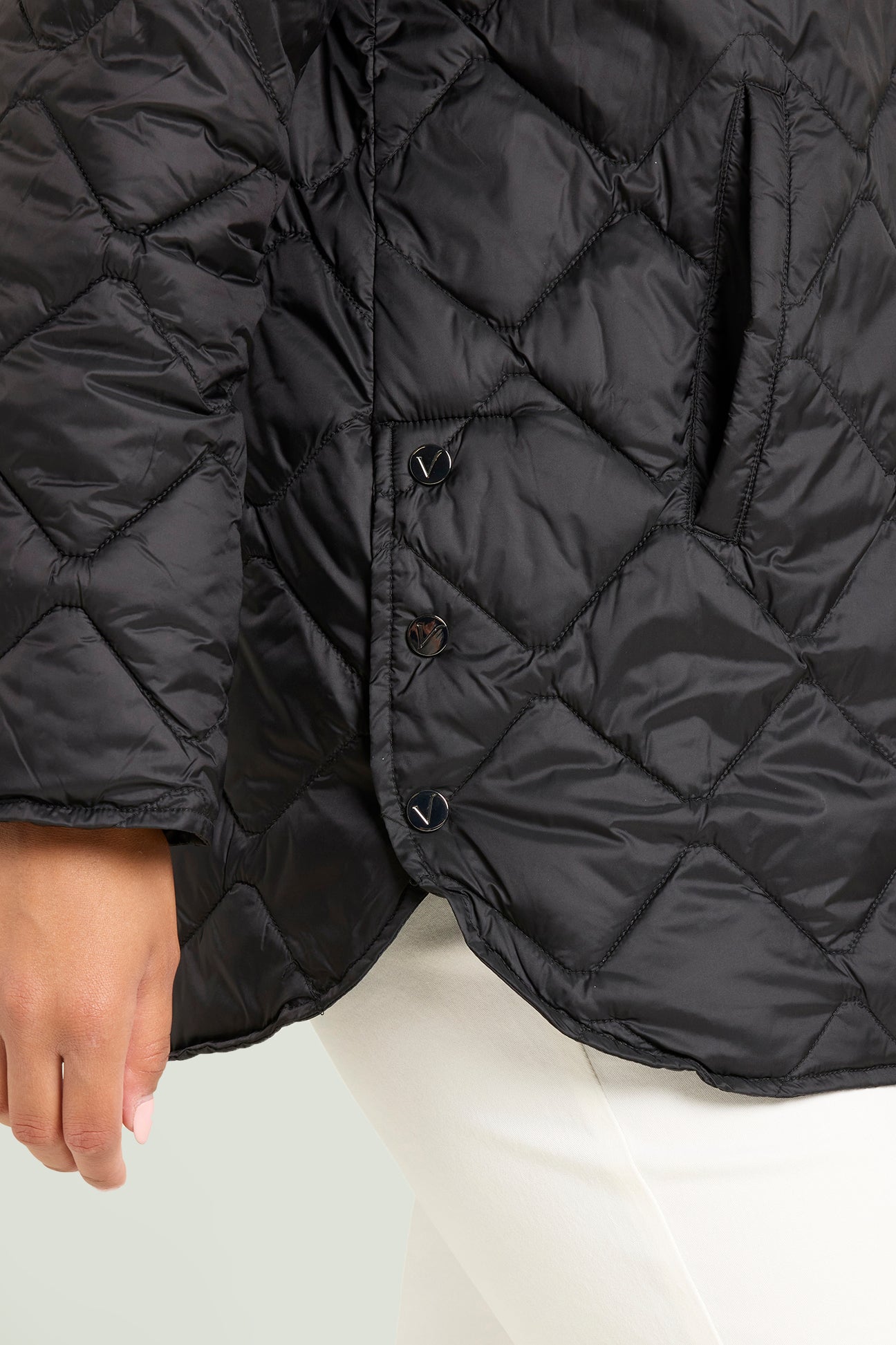 Piumino di peso autunnale in nylon cangiante con imbottitura fake down. Lunghezza media, linea leggermente svasata, spacchi laterali stondati con bottoni. Doppia chiusura con bottoni automatici nascosti e zip con doppio cursore. Tasche a filetto, cappuccio staccabile con coulisse e nastro gros grain. Tiretti e bottoni in metallo con finitura "gunmetal", personalizzati con il logo "V" di Luisa Viola.